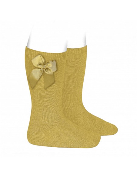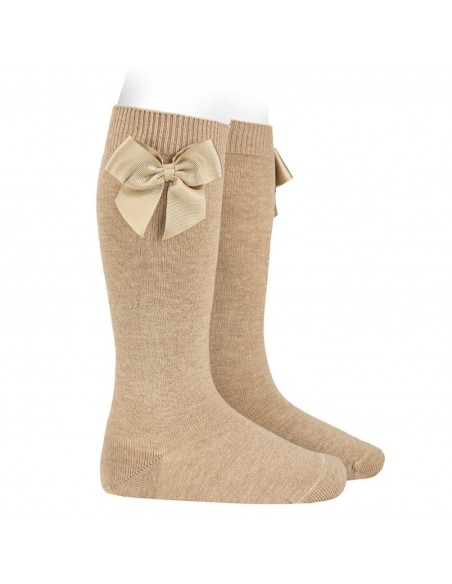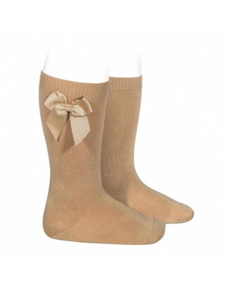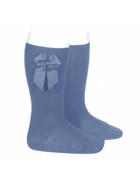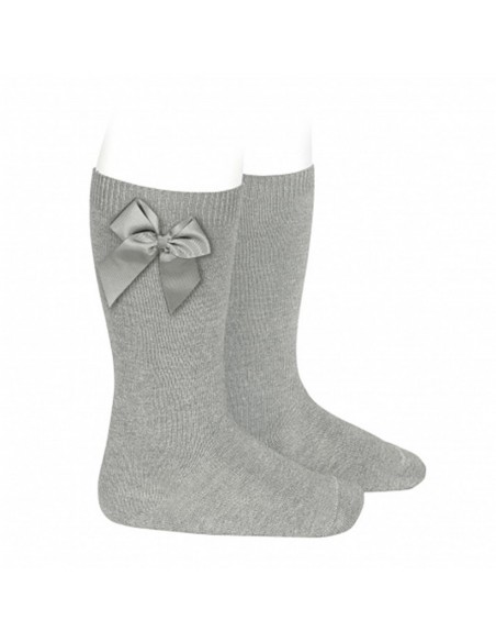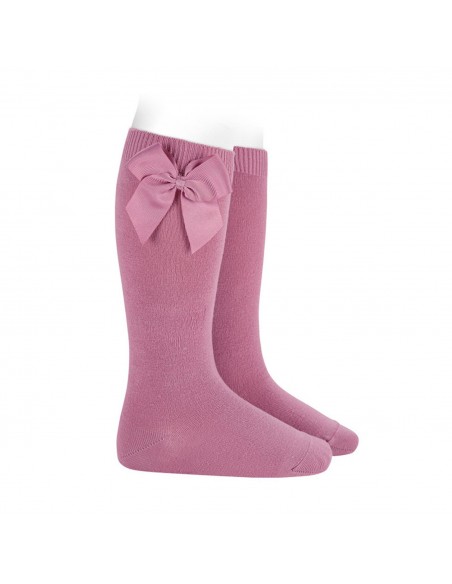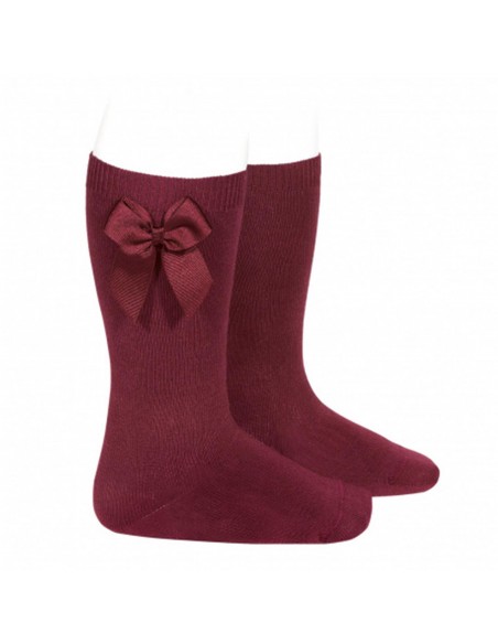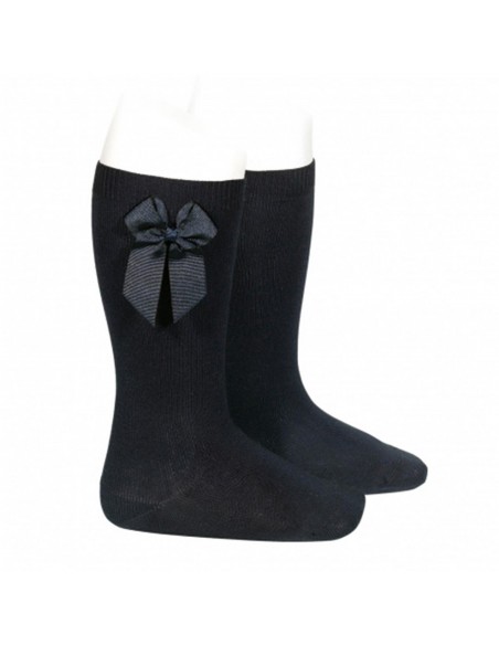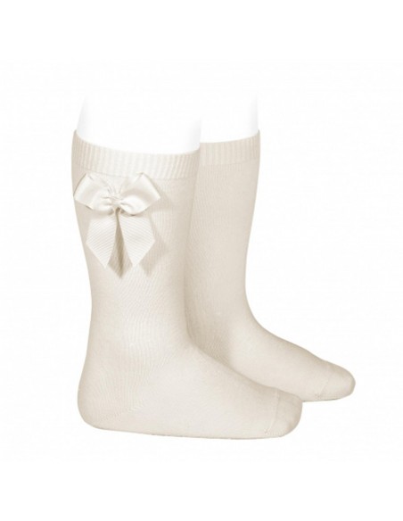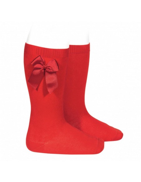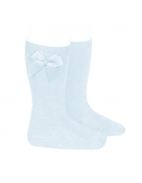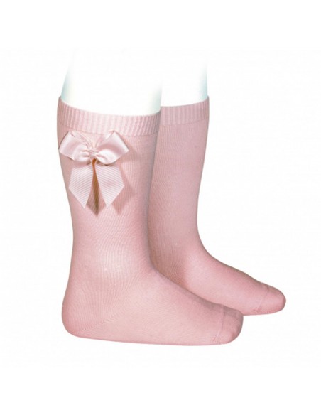 Calcetines de algodón, altos por debajo de la rodilla, en punto liso, con detalle de lazos de gros-grain a tono en el lateral. Disponible en una gran variedad de colores y tallas: T000 (0 a 3 meses), t00 ( t3 a 6 meses), t0 (12 meses) t4 (23 a 26), t6 ( 27 al 31), t8 (32 al 35)