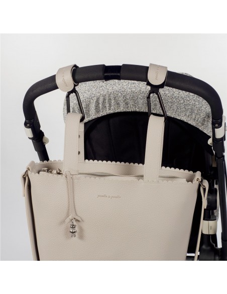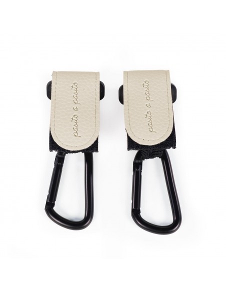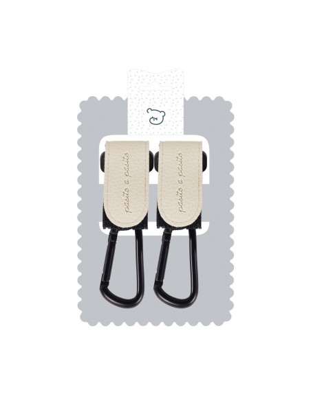 Set de 2 ganchos para cochecito Icon Cream en polipiel. Gancho de metal. Muy facil de colocar gracias a sus tiras con velcro. Perfecto para colgar la bolsa de canastilla o cualquier bolsa que necesites llevar en el cochecito. Soporta hasta 5 kgs de peso. Universal.