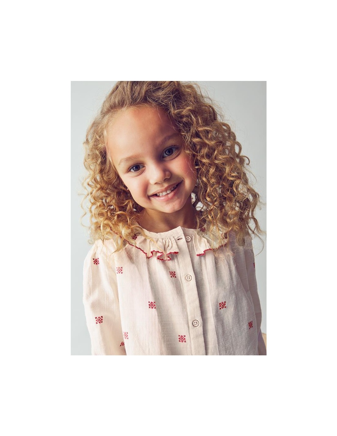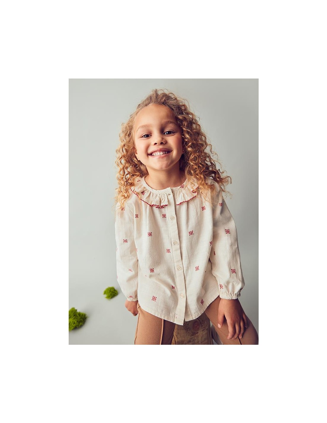 Blusa de manga larga con puños elásticos, cuello redondo con volante y botones enla parte delantera.