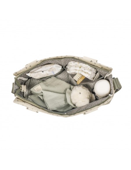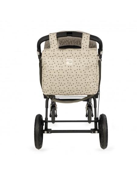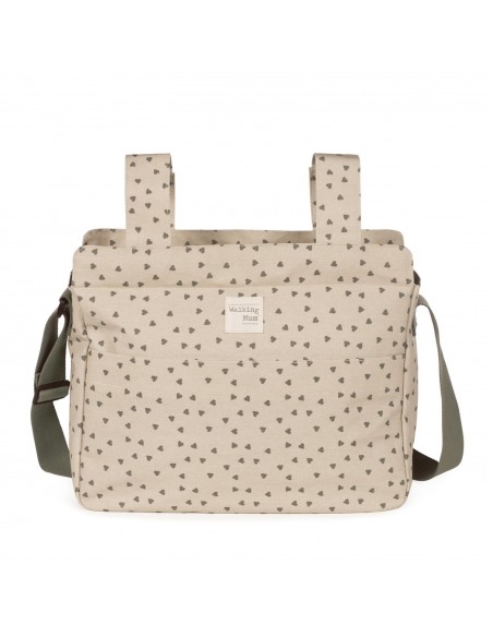 Bolso cambiador Poppy Musgo con corazones para silla de paseo que incluye cambiador para bebe. Bolsa canastilla muy ligera, resistente y de gran capacidad para llevar todo lo necesario para el paseo del bebe. Tiene multiples bolsillos para poder tener todo ordenado. Dispone en el exterior de un práctico bolsillo frontal para tener a mano lo imprescindible. En el interior incopora un bolsillo plastificado para la ropa húmeda,un bolsillo térmico para biberones y dos bolsillos para lo que necesites