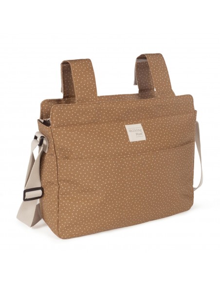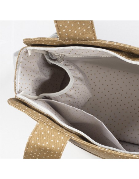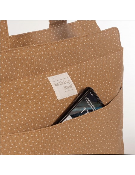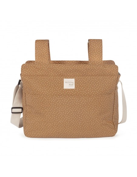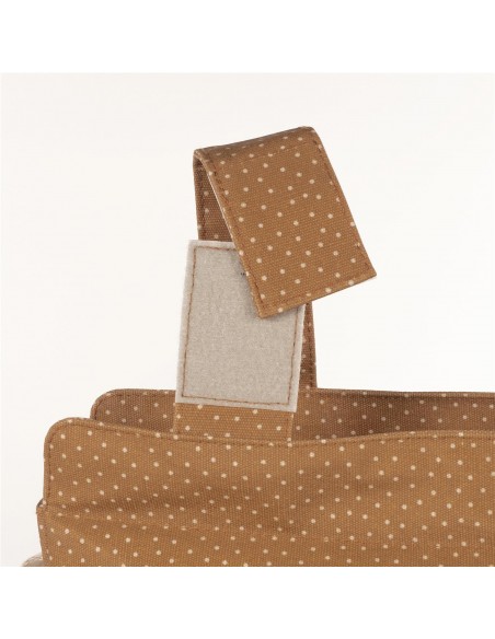 Bolso cambiador Poppy Canela de topito para silla de paseo que incluye cambiador para bebe. Bolsa canastilla muy ligera, resistente y de gran capacidad para llevar todo lo necesario para el paseo del bebe. Tiene multiples bolsillos para poder tener todo ordenado. Dispone en el exterior de un práctico bolsillo frontal para tener a mano lo imprescindible. En el interior incopora un bolsillo plastificado para la ropa húmeda, un bolsillo térmico para biberones y dos bolsillos.