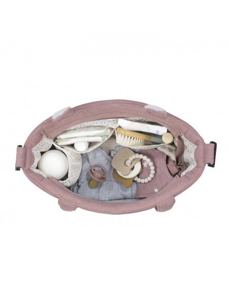 Bolso cambiador Gala Cerise de pana para silla de paseo que incluye cambiador para bebe. Bolsa canastilla muy ligera, resistente y de gran capacidad para llevar todo lo necesario para el paseo del bebe. Tiene multiples bolsillos para poder tener todo ordenado. En el interior incopora un bolsillo plastificado para la ropa húmeda, un bolsillo térmico para biberones y dos bolsillos para lo que necesites tener más a mano. La bolsa tiene un sistema universal de fijación.