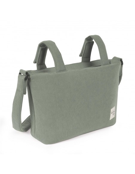 Bolso cambiador Gala Mint de pana para silla de paseo que incluye cambiador para bebe. Bolsa canastilla muy ligera, resistente y de gran capacidad para llevar todo lo necesario para el paseo del bebe. Tiene multiples bolsillos para poder tener todo ordenado. En el interior incopora un bolsillo plastificado para la ropa húmeda, un bolsillo térmico para biberones y dos bolsillos para lo que necesites tener más a mano. La bolsa tiene un sistema universal de fijación, con 2 asas cortas que facilita