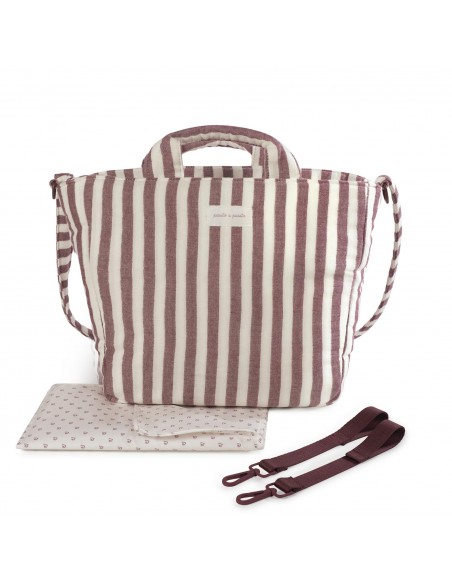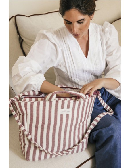 La bolsa para carrito de bebé o el bolso para silla de paseo Cherry Rayas de Pasito a pasito es un modelo único, elaborado en algodón 100% con un delicado tejido de rayas. Su tratamiento waterproof la hace resistente al agua, garantizando protección y durabilidad en el día a día. Es un diseño muy elegante y práctico que ofrece gran capacidad para que puedas llevar de todo. Viene acondicionado con doble asa, una larga para colgar en el hombro y unas cortas de mano.