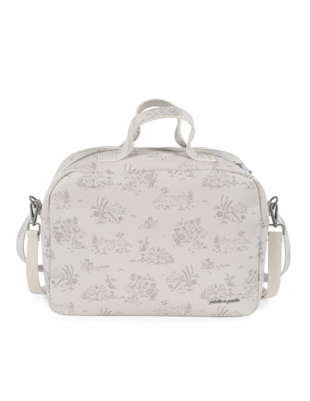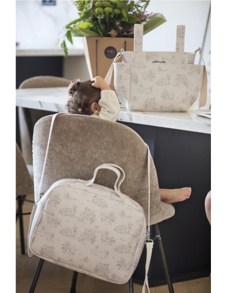 La bolsa para carrito de bebé o el bolso para silla de paseo Toile de Jouy Cream de Pasito a pasito es un modelo único, elaborado en resistente y delicada polipiel estampada para llevar todo lo que necesita tu bebé al salir de casa. Es un diseño muy elegante y práctico que ofrece gran capacidad para que puedas llevar de todo. Viene acondicionado con doble asa, una larga para colgar en el hombro y unas cortas de mano. Incluye asas adicionales universales para colgarla al cochecito.