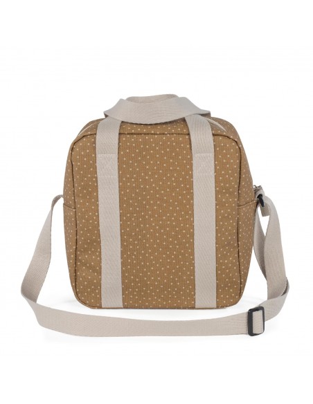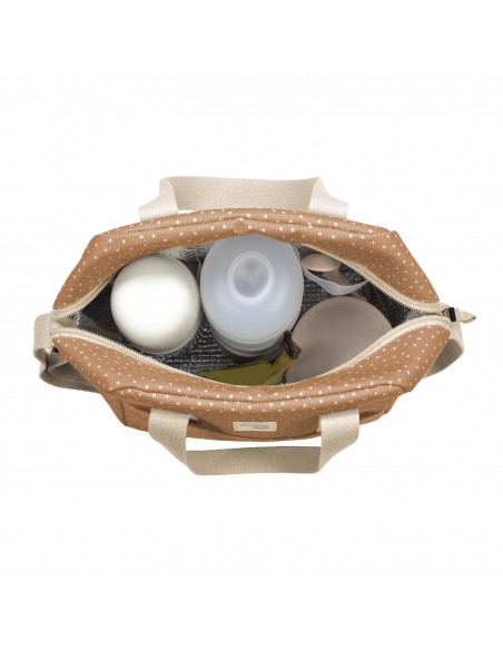 Bolsa térmica para biberones Poppy Canela de topitos. Mantiene la temperatura durante 4 horas. También incorpora una asa larga para poder colgarla en el hombro y asa corta de mano. Gran calidad y mucho estilo. Fabricada en un material resistente y de fácil limpieza. Walking Mum protege a tu bebé utilizando los mejores tejidos, libres de colorantes azoicos y sustancias nocivas para la salud.