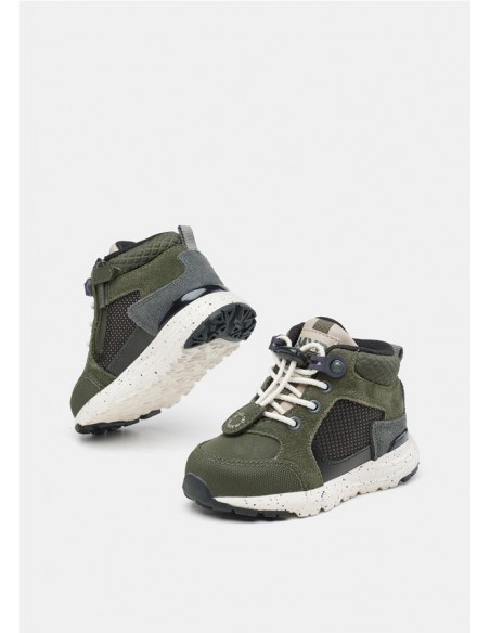 Botin outdoor ligero, fabricado en piel bovina y poliuretabo, con puntera reforzada en goma y ajuste en el empeine con una goma elástica, para mejor agarre y fácil puesta.