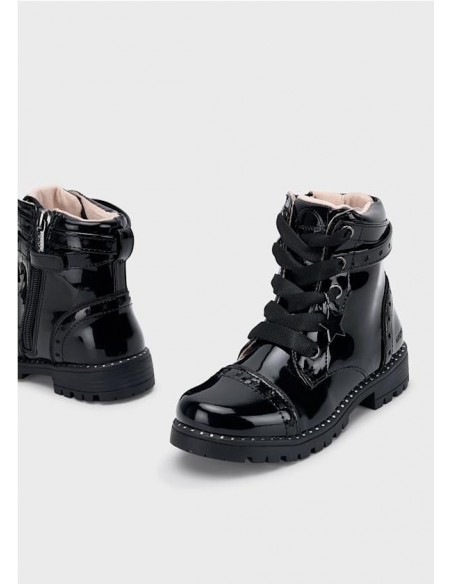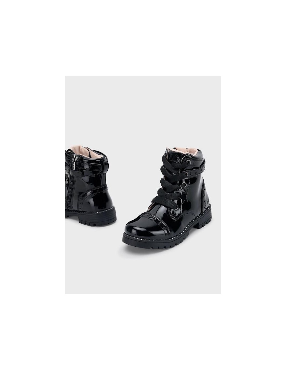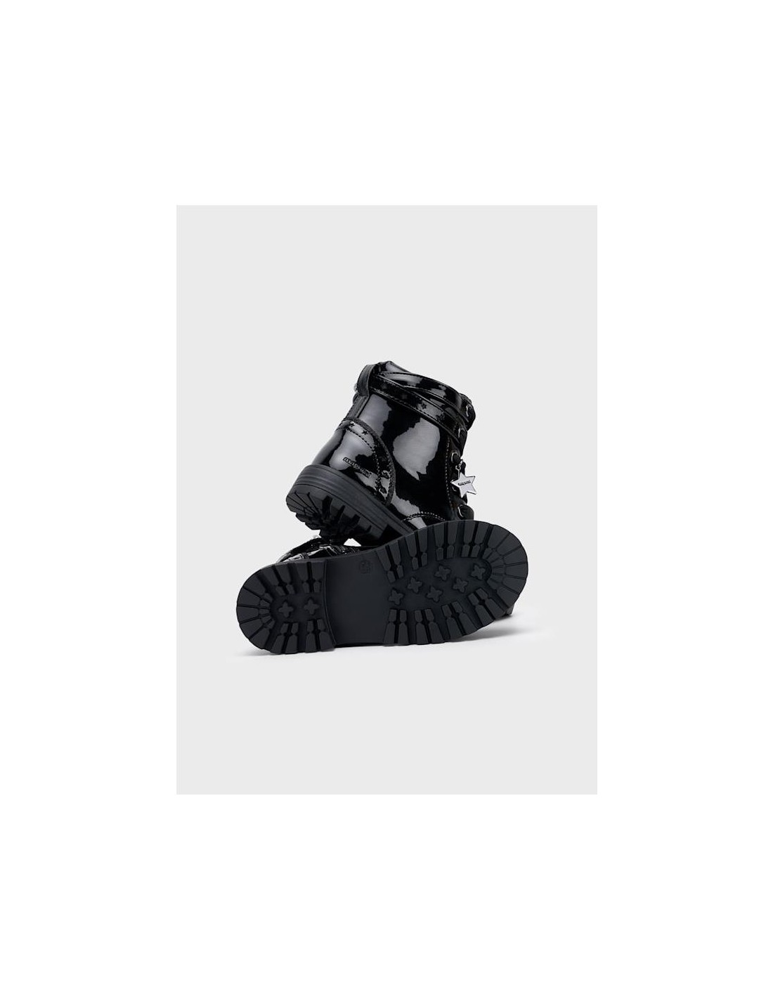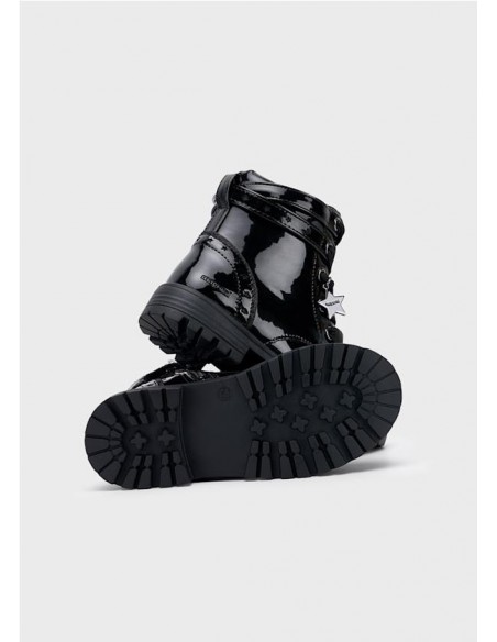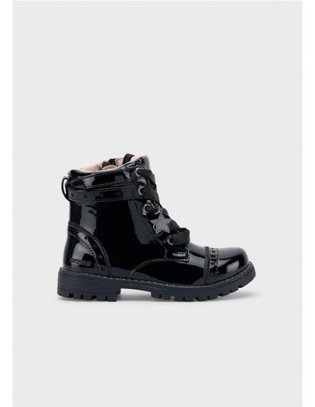 Botines infantiles para niña imprescindibles en cualquier armario de invierno. Un zapato práctico y abrigado para los días más fríos. Elementos de adorno: estrellas. Material exterior con efecto charol. Forro interior y plantilla de algodón transpirable. Suela de caucho ligera y flexible. Cierre con velcro ajustable que garantiza una perfecta sujeción del pie. Cierre con cordones que permiten un mejor ajuste y mayor sujeción del pie.