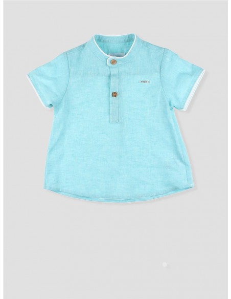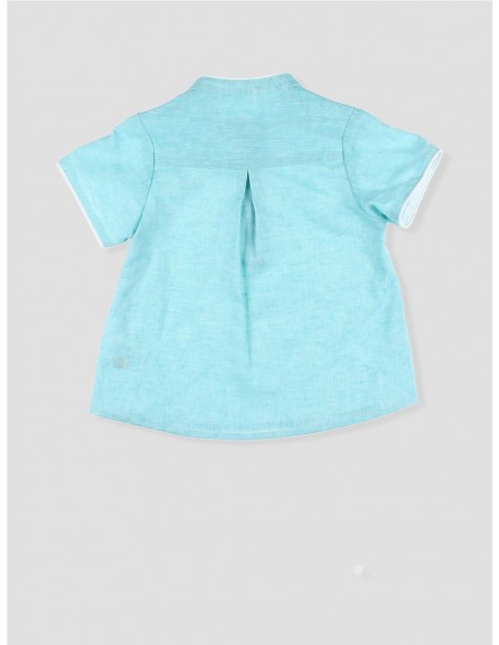 Camisa manga corta de niño en tejido mezcla de lino y algodón color turquesa, sinónimo de frescura y elegancia. Su diseño incluye un moderno cuello mao, detalle de botones de madera y vivos en blanco, que aportan un toque sofisticado. El tejido transpirable y ligero garantiza la máxima comodidad. Perfecta para eventos veraniegos o looks casuales con estilo