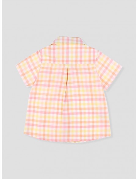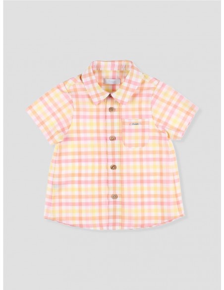 Camisa de cuadros en tonos pastel de la Colección Holanda, diseñada para un look fresco y actual. Confeccionada en tejido ligero y transpirable, cuenta con cuello clásico, cierre de botones de madera y un bolsillo decorativo en el pecho. Su estampado suave la convierte en una prenda versátil, ideal para ocasiones especiales y paseos diarios.
