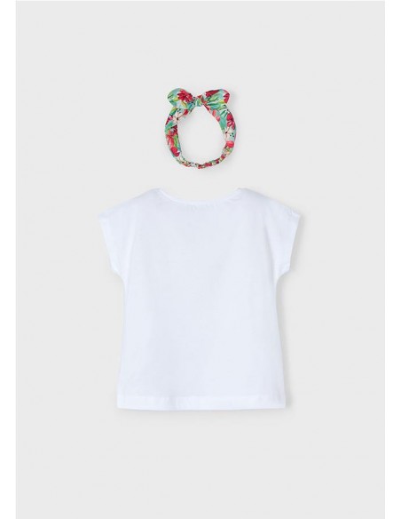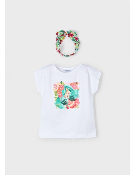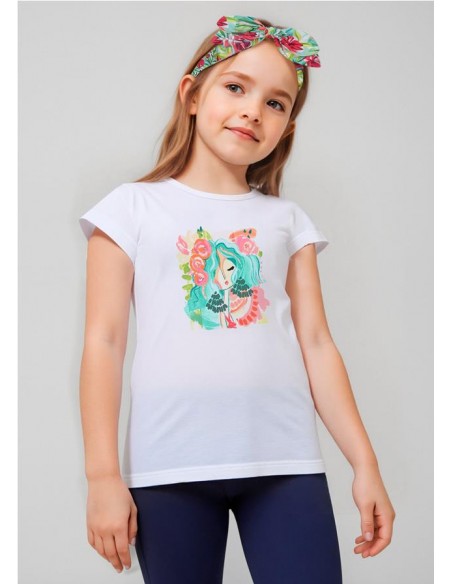 Camiseta de manga corta para niña. Modelo con cuello barco. Tejido 100% algodón. Elementos de adorno: serigrafía (print).