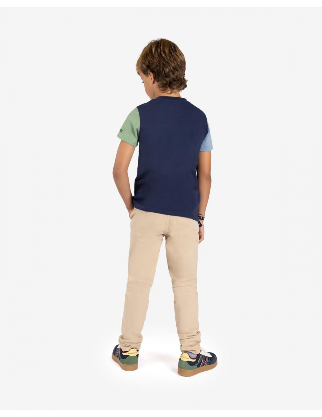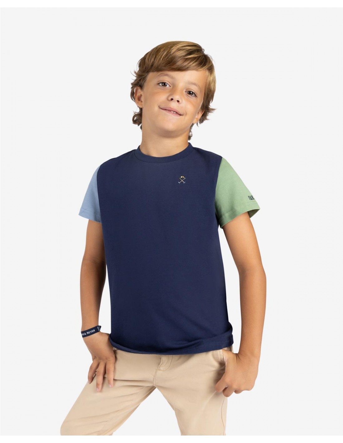 Camiseta manga corta 100% algodón. Diseño color block con contraste de mangas y logo bordado. Un guiño a la estética college, pensada para destacar. Estilo con energía y actitud.