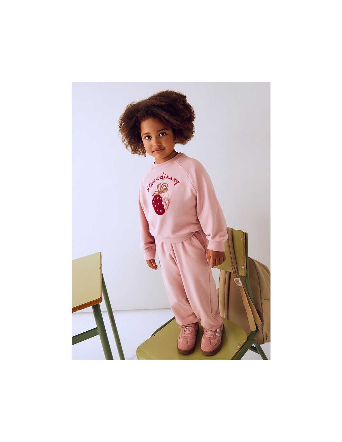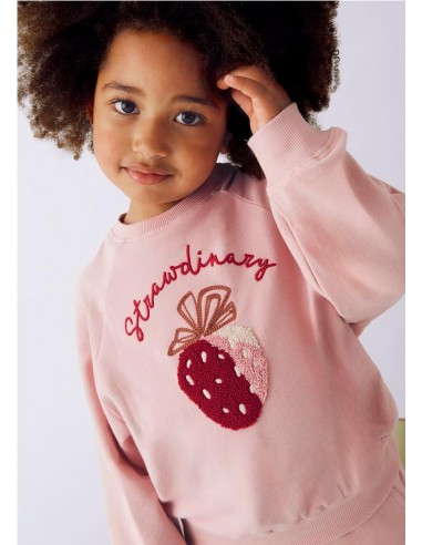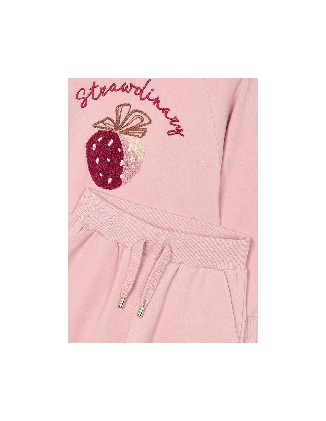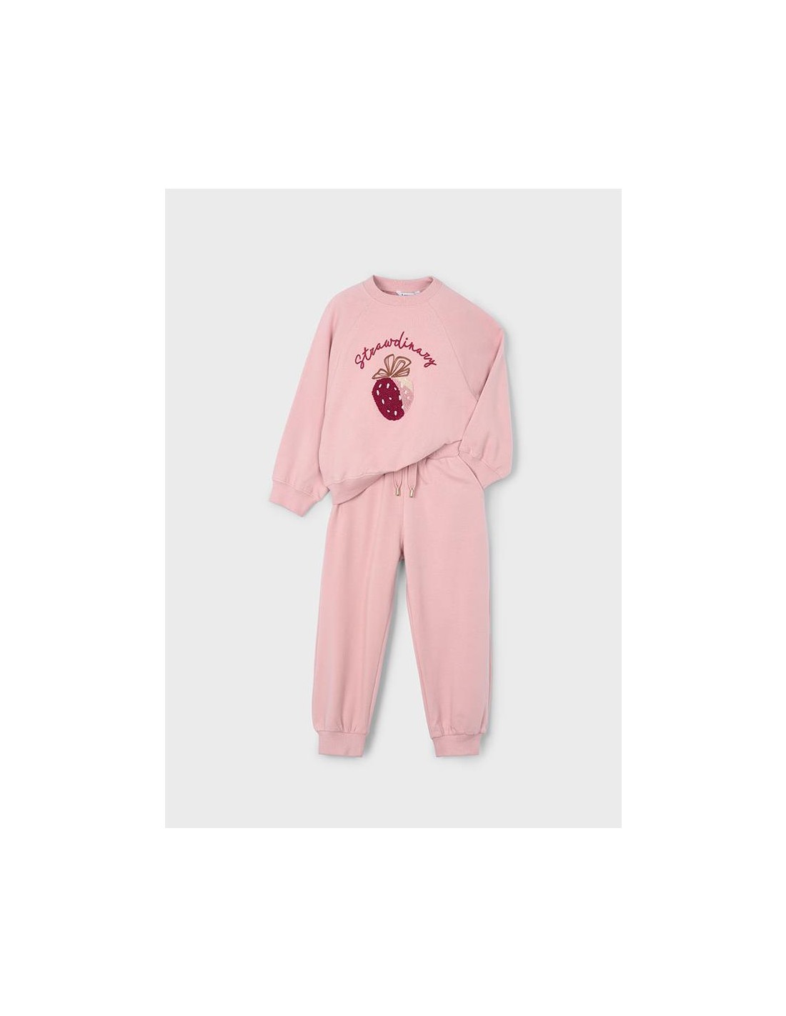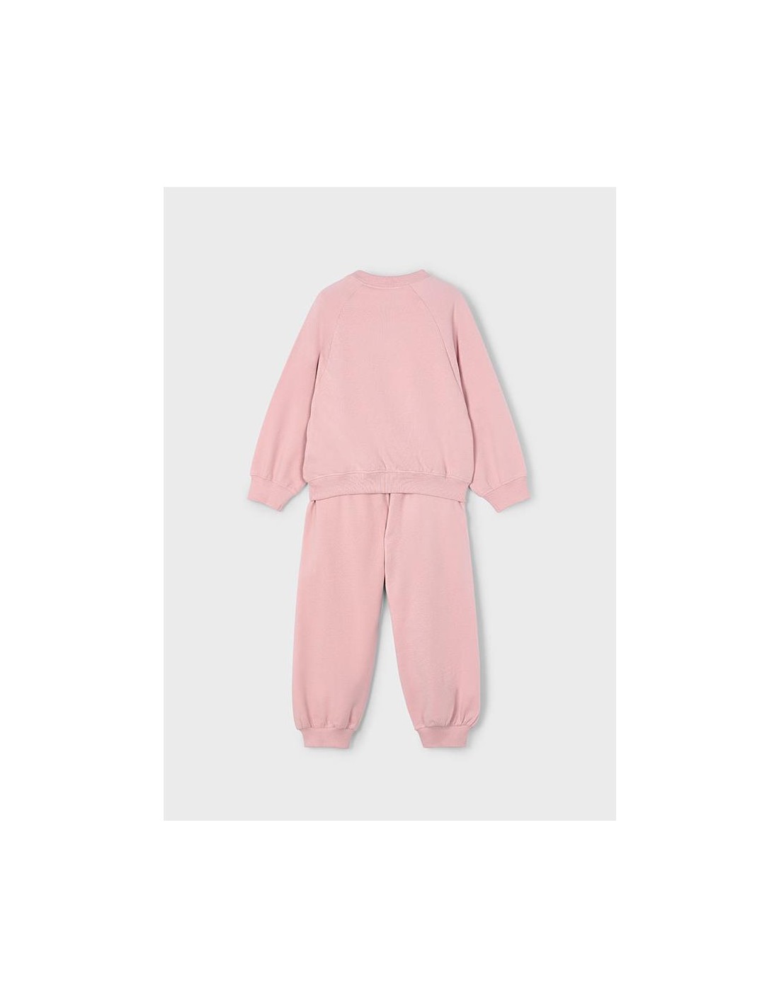 Chándal 2 piezas de sudadera bordada en la parte delantera, con cuello redondo y puños en bajo y manga. Pantalón largo deportivo con cintura elástica y ajustable.