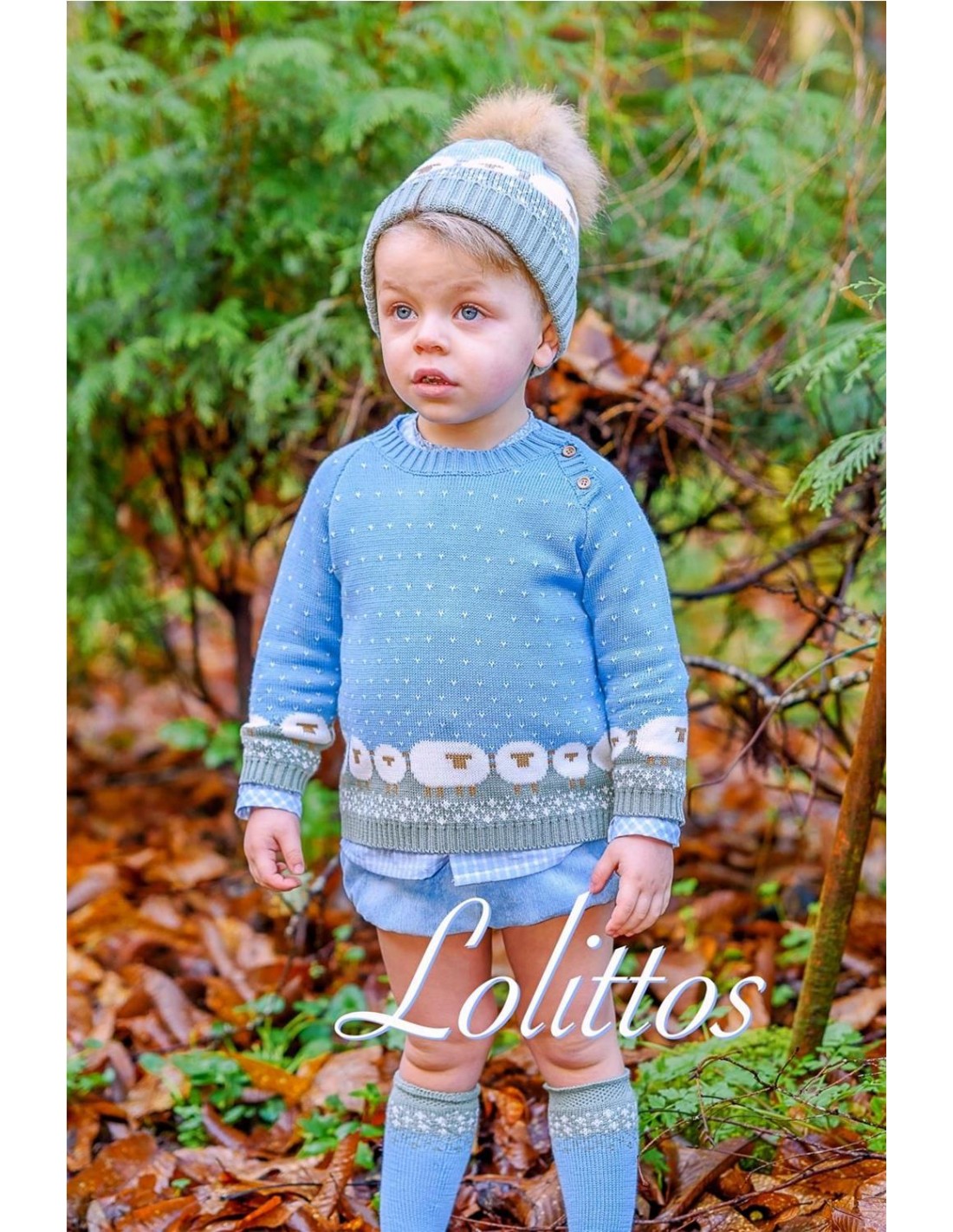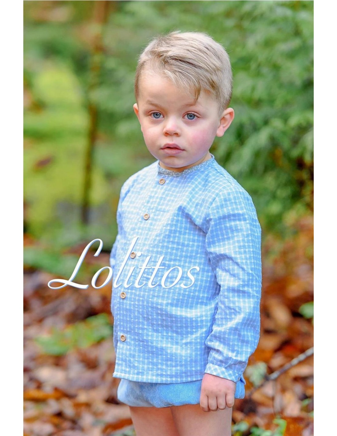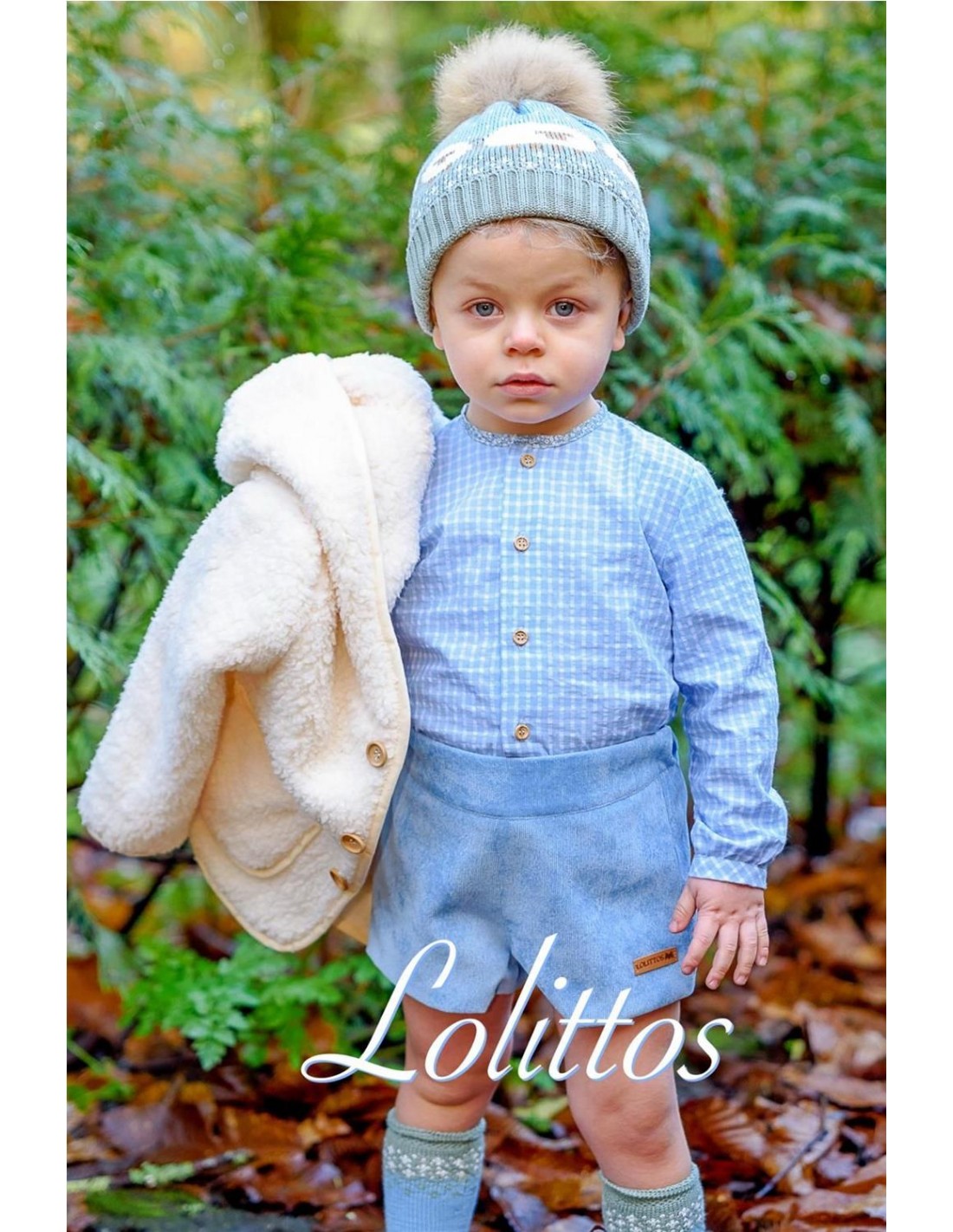 El conjunto de tres piezas para niño de la colección Borreguito de Lolittos está compuesto por lna camisa de cuadro de vichy blanco y azul claro ded manga larga, bermuda cortita con goma ajustada en la parte de atrás y jersey axul con estampado de borreguillos en la parte de abajo.