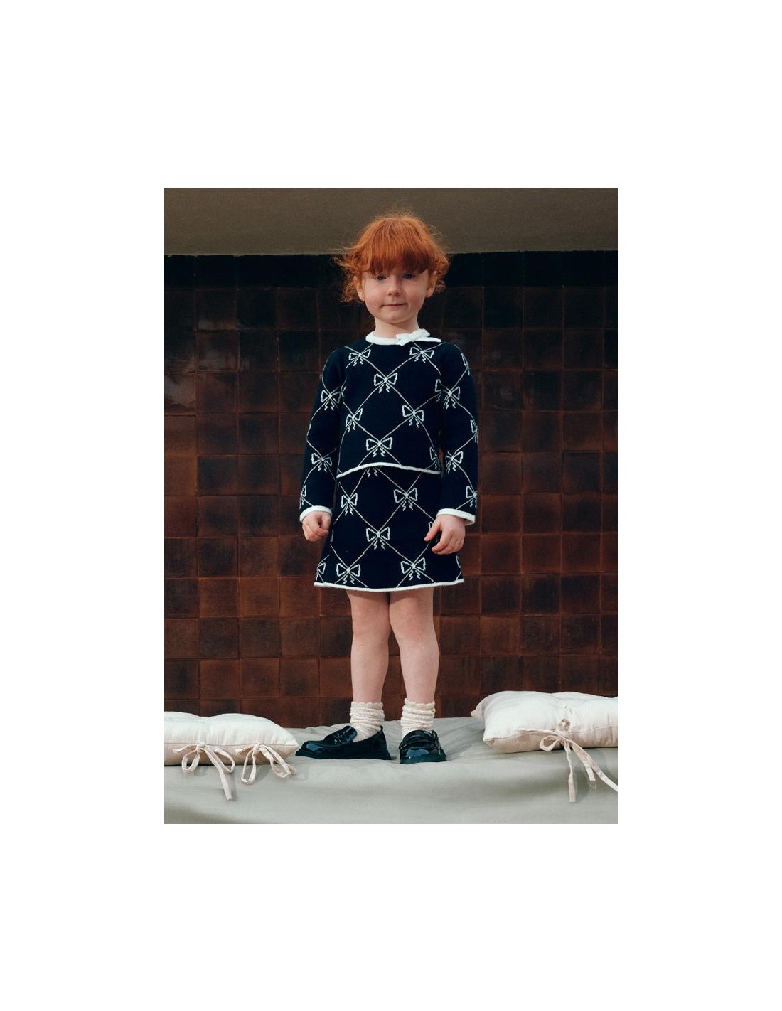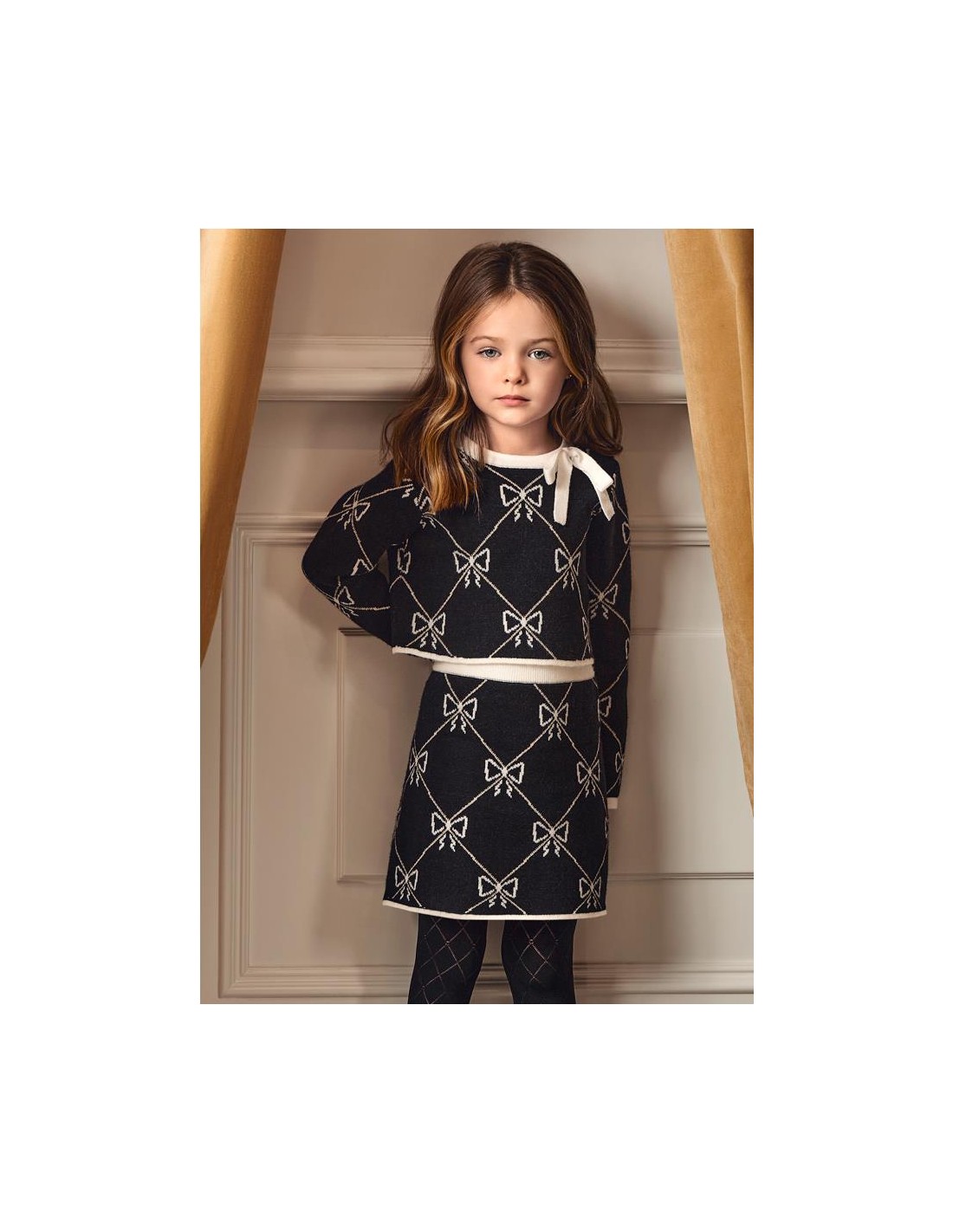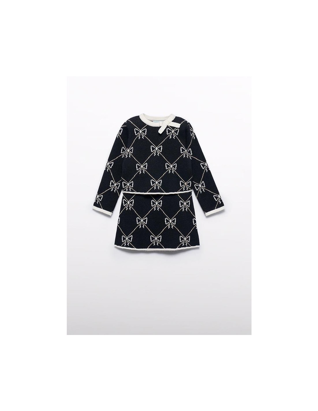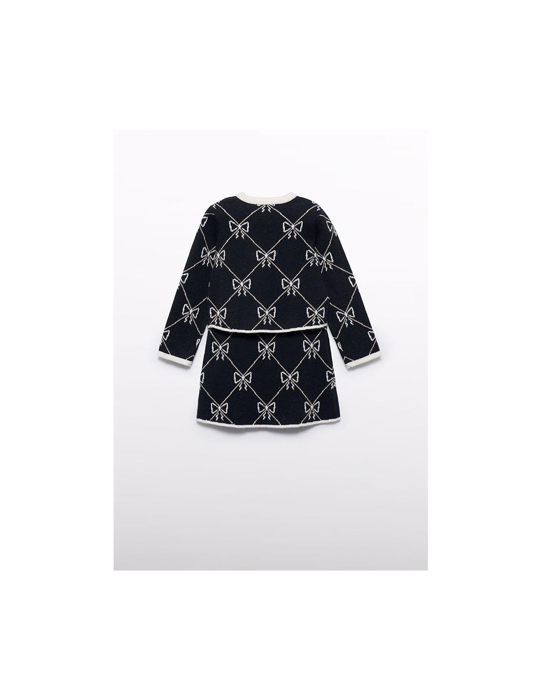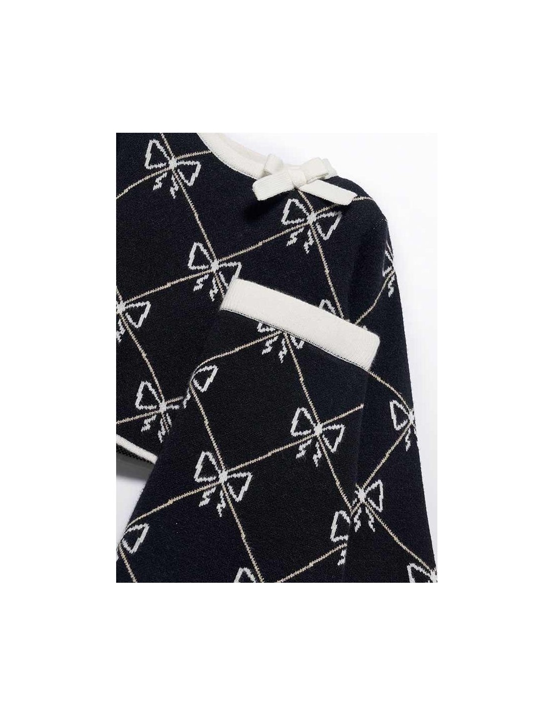 Conjunto tricot falda niña estampada fondo negro y dibujo geométrico en todo el conjunto, Jersey amplio de cuello redondo manga larga y lazada en el cuello.