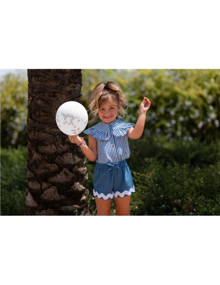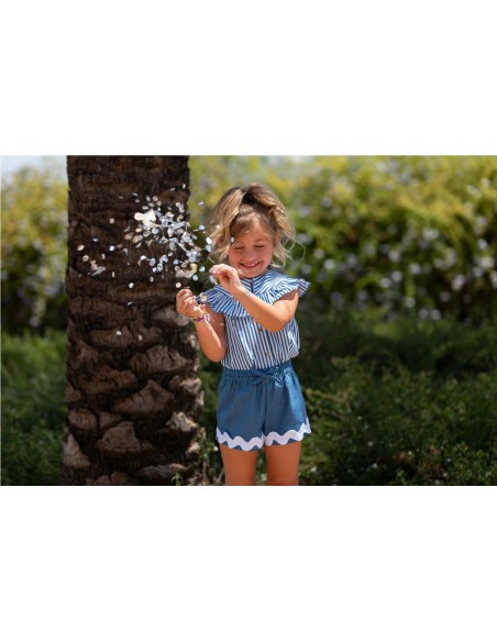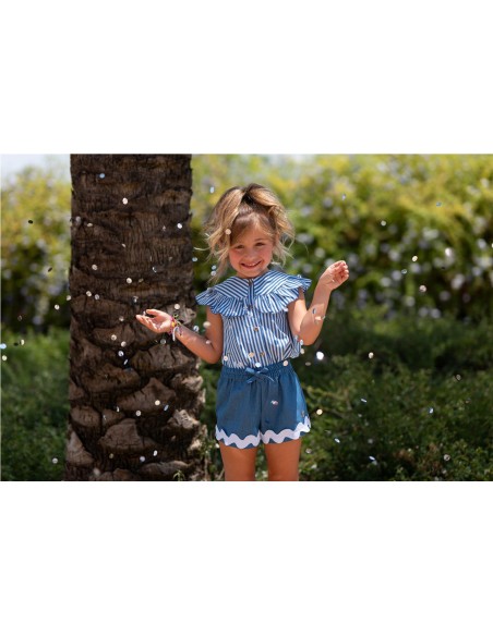 Camisa de rayas de manga corta, cuello volante, botones delanteros en madera y corte tipo evasé en la parte trasera combinada con un origunal short en tejido denim con goma en toda la cintura y picunela ancha en el bajo.