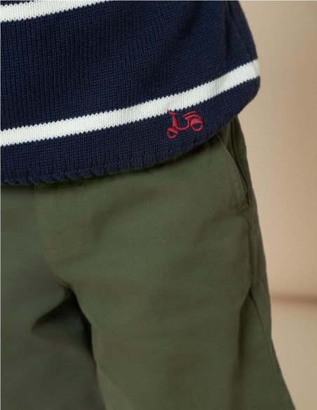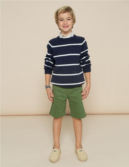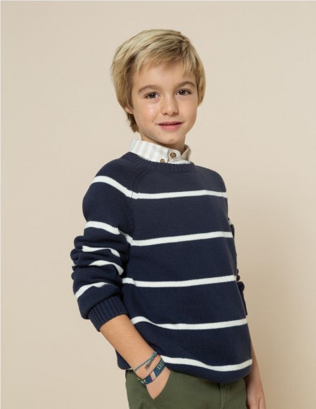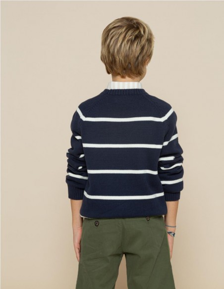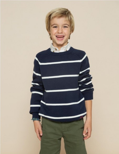 Jersey marino de rayas lgodón, cuello redondo, punto de canalé ne los puños y moto bordada en la parte inferior.