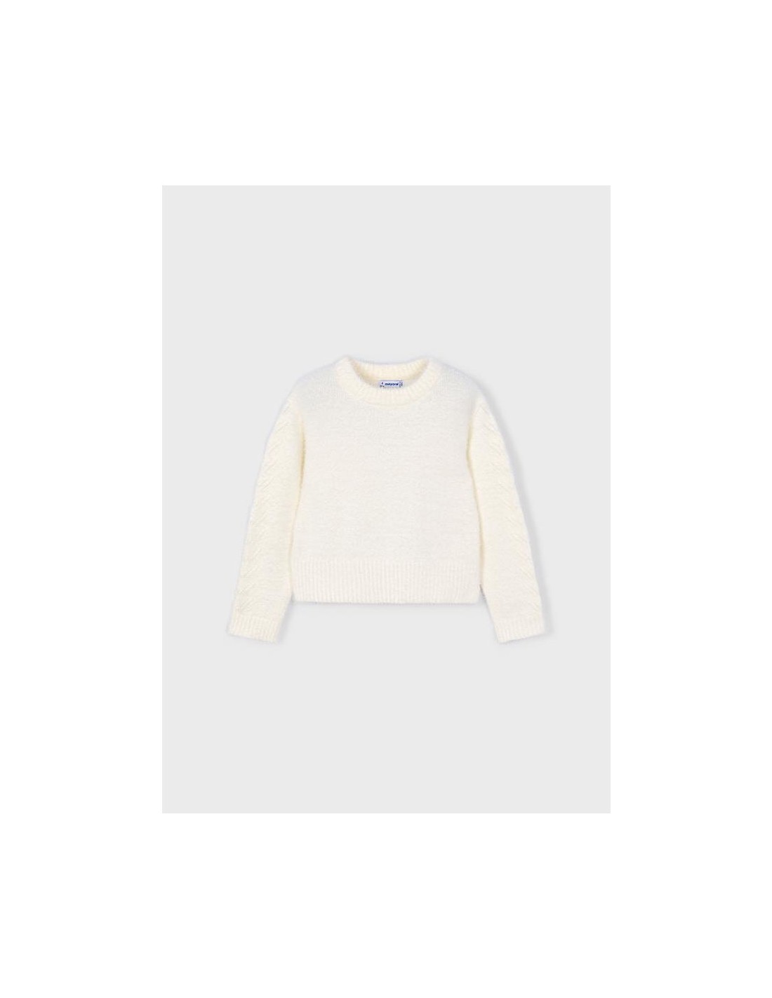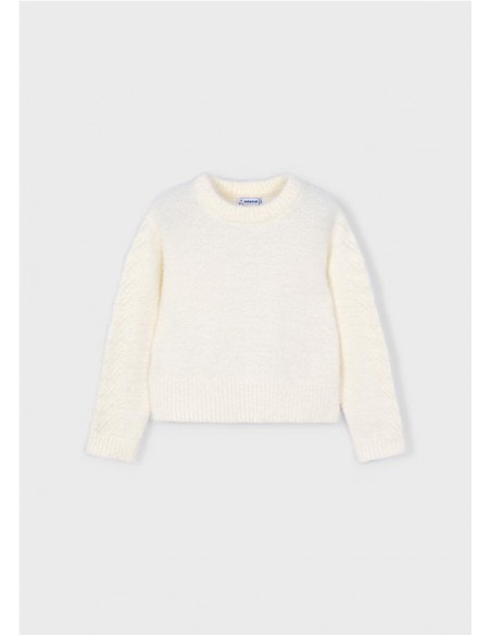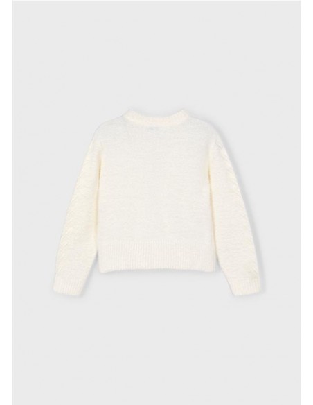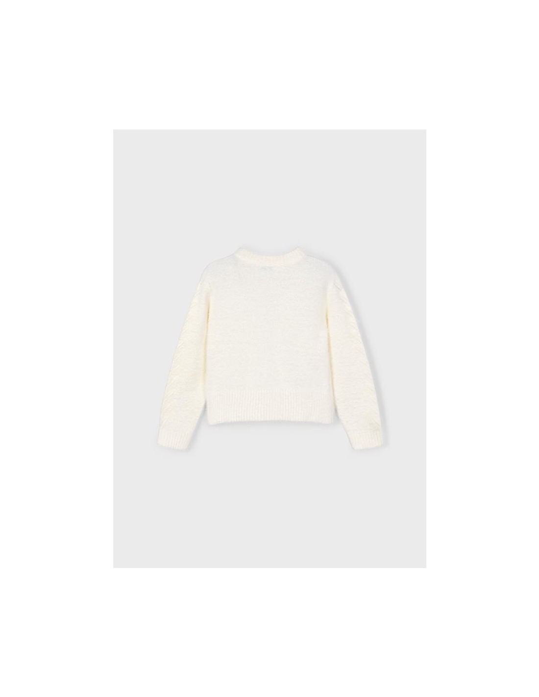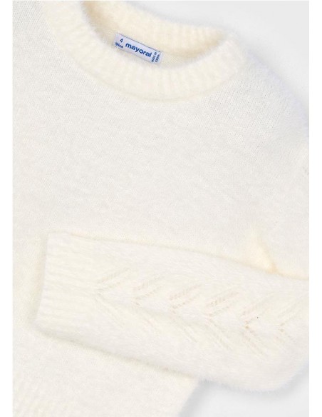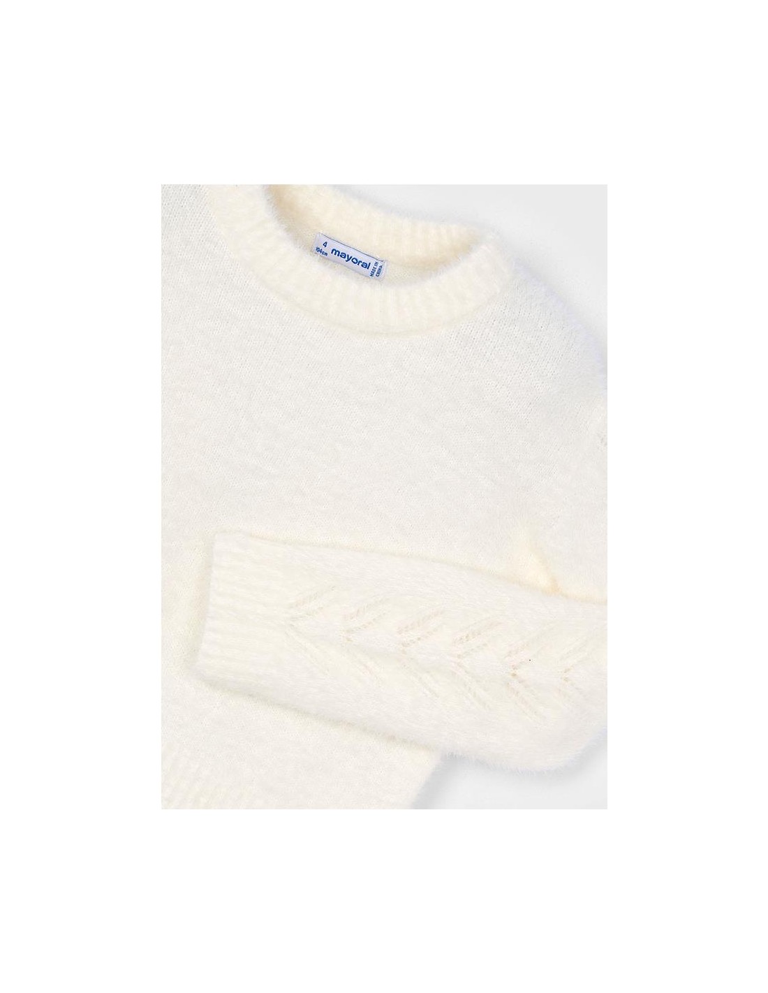 Jersey de manga larga para niña. Cuello redondo. Suave y gustoso tejido exterior de pelo. Cómodo tejido de punto. Elementos de adorno: motivos calados.