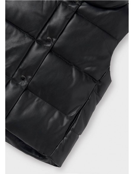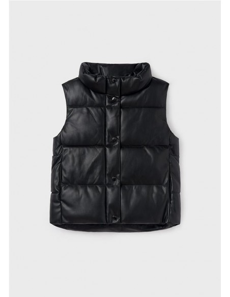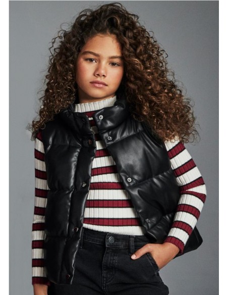 Chaleco sin mangas para chica. Cuello envolvente. Exterior textil con efecto acolchado. Bajo con goma elástica regulable para ajustar el talle. Bolsillos en los laterales.