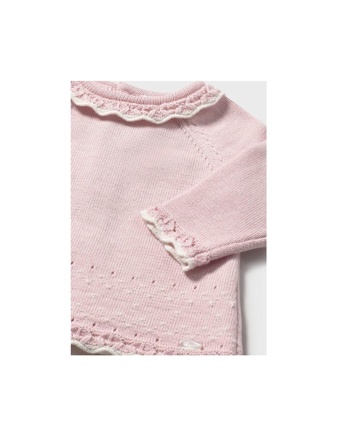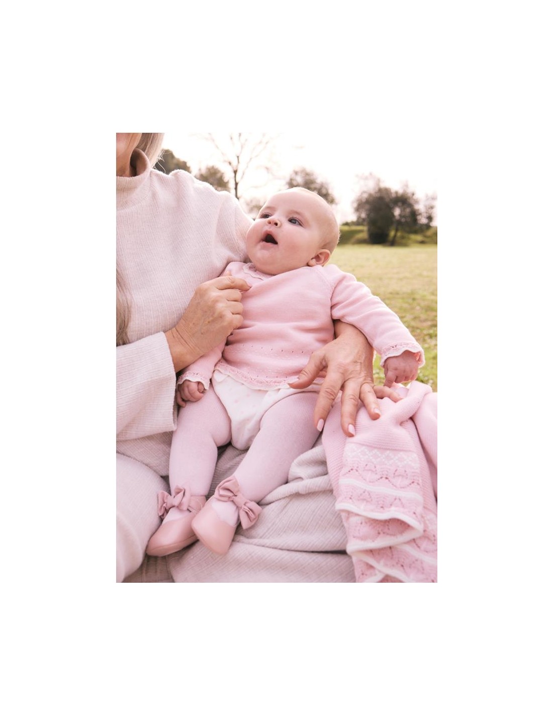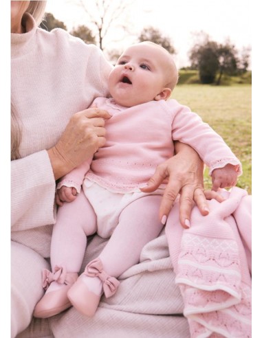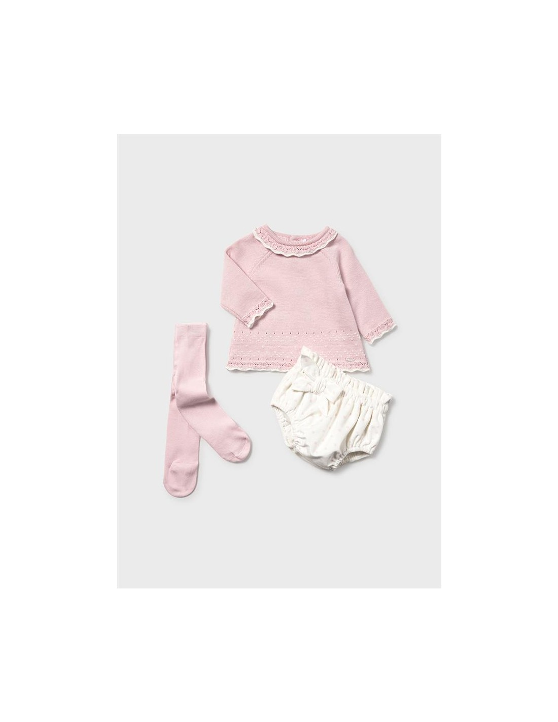 Original conjunto de tres piezas para recién nacida. Jersey de manga larga con cuello redondo y detalles al tono con cierre trasero y ranita con frunces en la cintura y lazote grande en la parte delantesa y leotardo al tono del jersey.