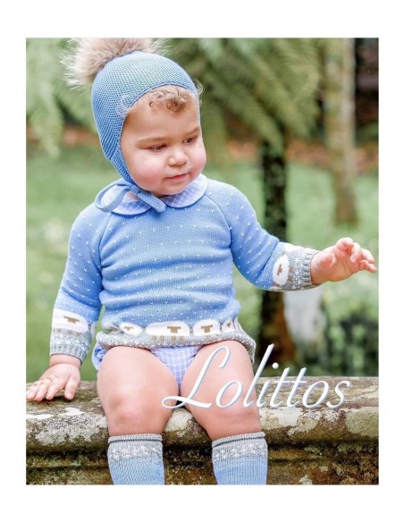 El conjunto de jubón para niño de la colección Borreguito de Lolittos está formado por un jersey de punto azul con estampado de borreguitos y cuello bebé en cuadritos de vichy azul y blanco al igual que el cubre.