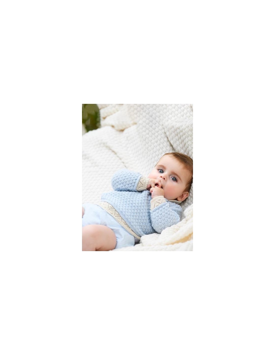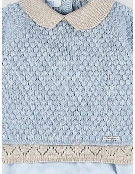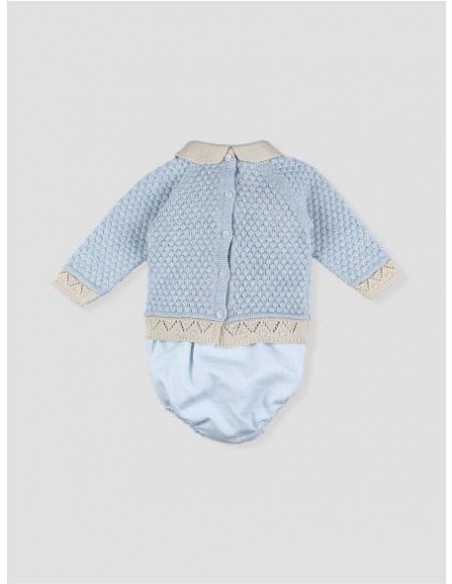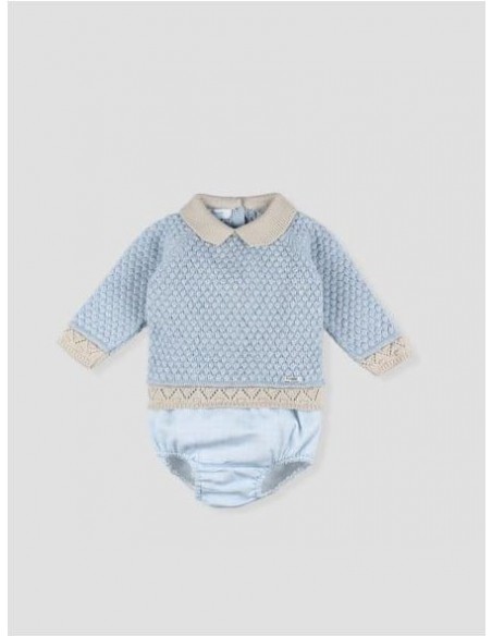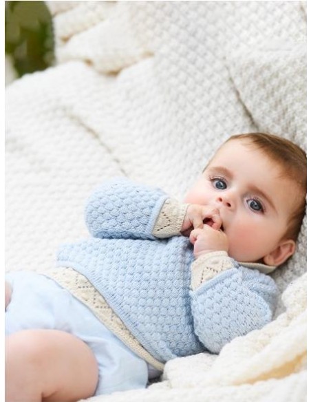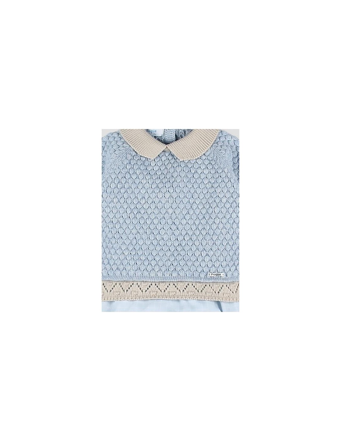 El conjunto de jubón y braguita Ladera para bebé destaca por su delicadeza y diseño cuidado. El jubón, en punto azul celeste con textura de panal, incorpora cuello camisero beige y acabados calados en puños y bajo. La braguita de tela en tono coordinado añade ligereza y resulta cómoda para el movimiento del bebé. Ideal tanto para el día a día como para ocasiones especiales por su estilo y practicidad.