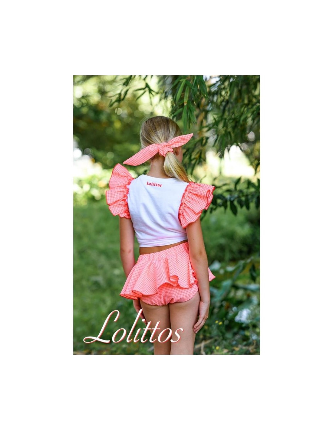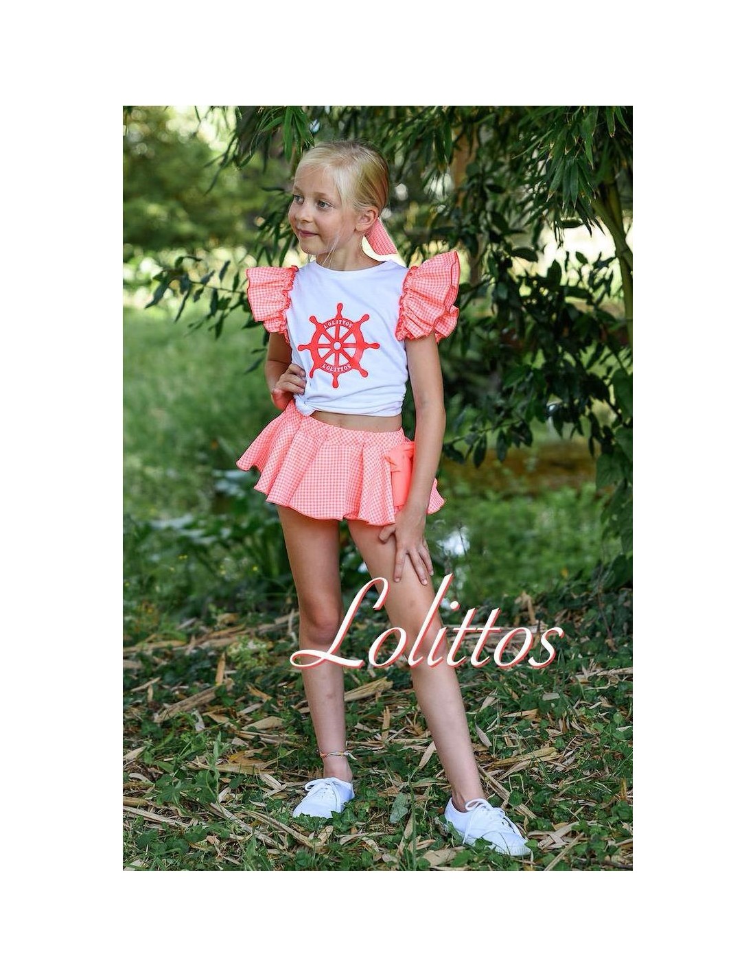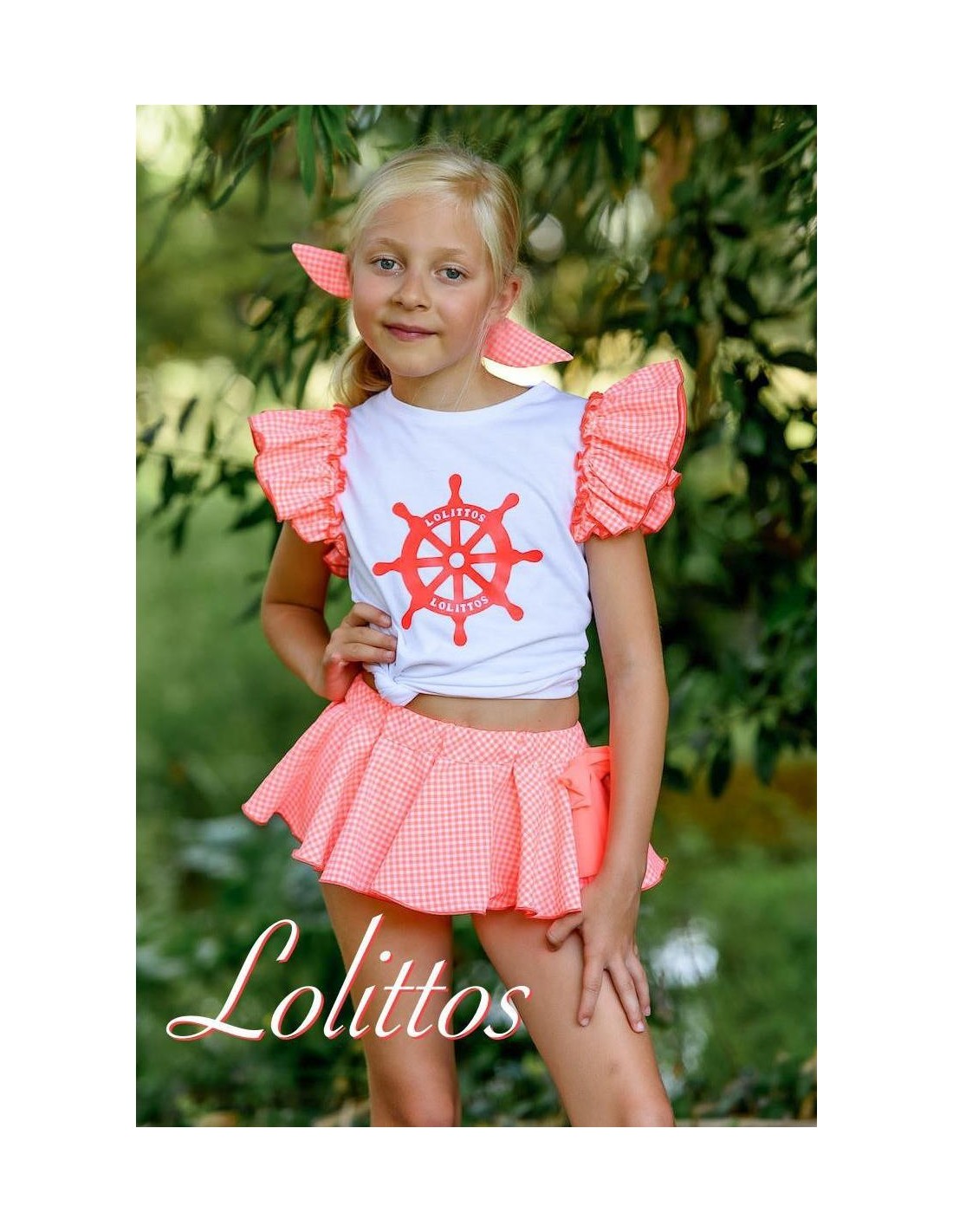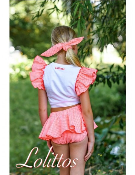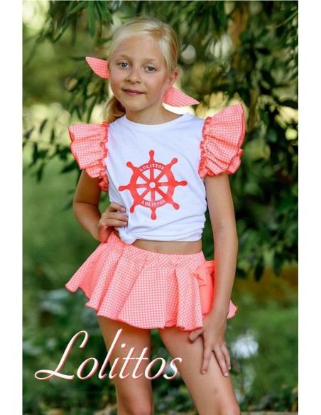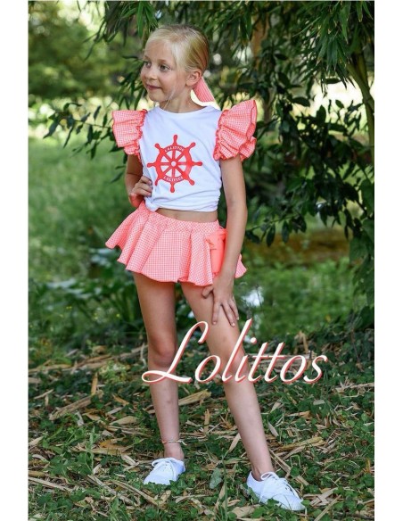 Conjunto de camiseta blanca con cuello redondo, dibujo estampado en la pechera y volantes en la sisa de la camiseta coordinada con el cubrefalda de vuelo fabricado en vichy naranja flúor con blanco.