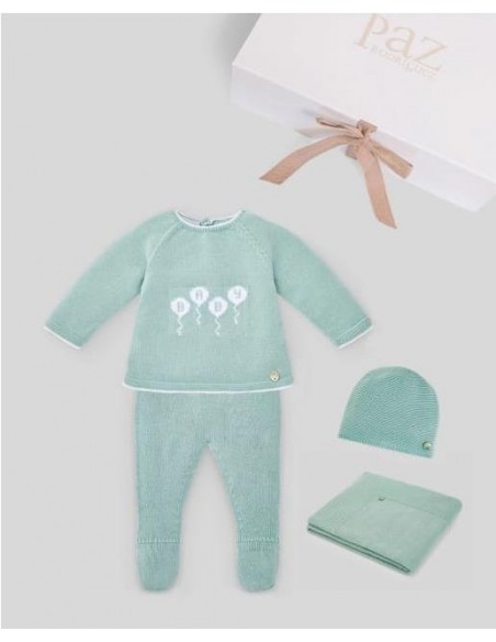 Conjunto unisex para bebé, perfecto para los primeros meses de vida. Incluye cuatro piezas: jubón o jersey, polaina con pie, gorro y manta. La caja PAZ Rodríguez añadirá el toque ideal para un regalo perfecto.