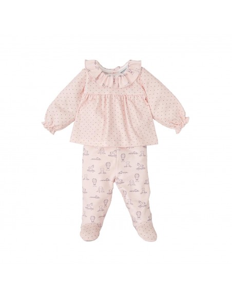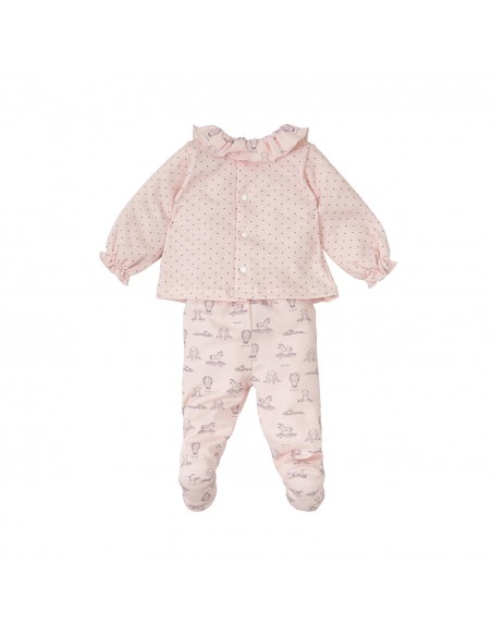 Conjunto de bebé 100% algodón 2 piezas con multiestampado: jubón estampado topitos, cuello volante, corte en el pecho y broches en la espalda. Polaina algodón estampada motivos toile de joui.