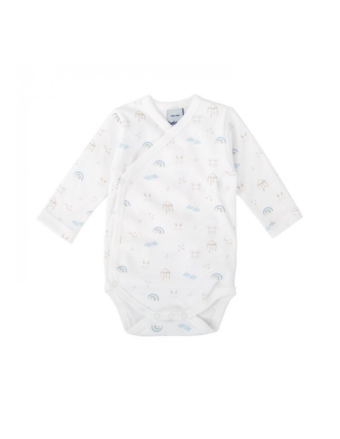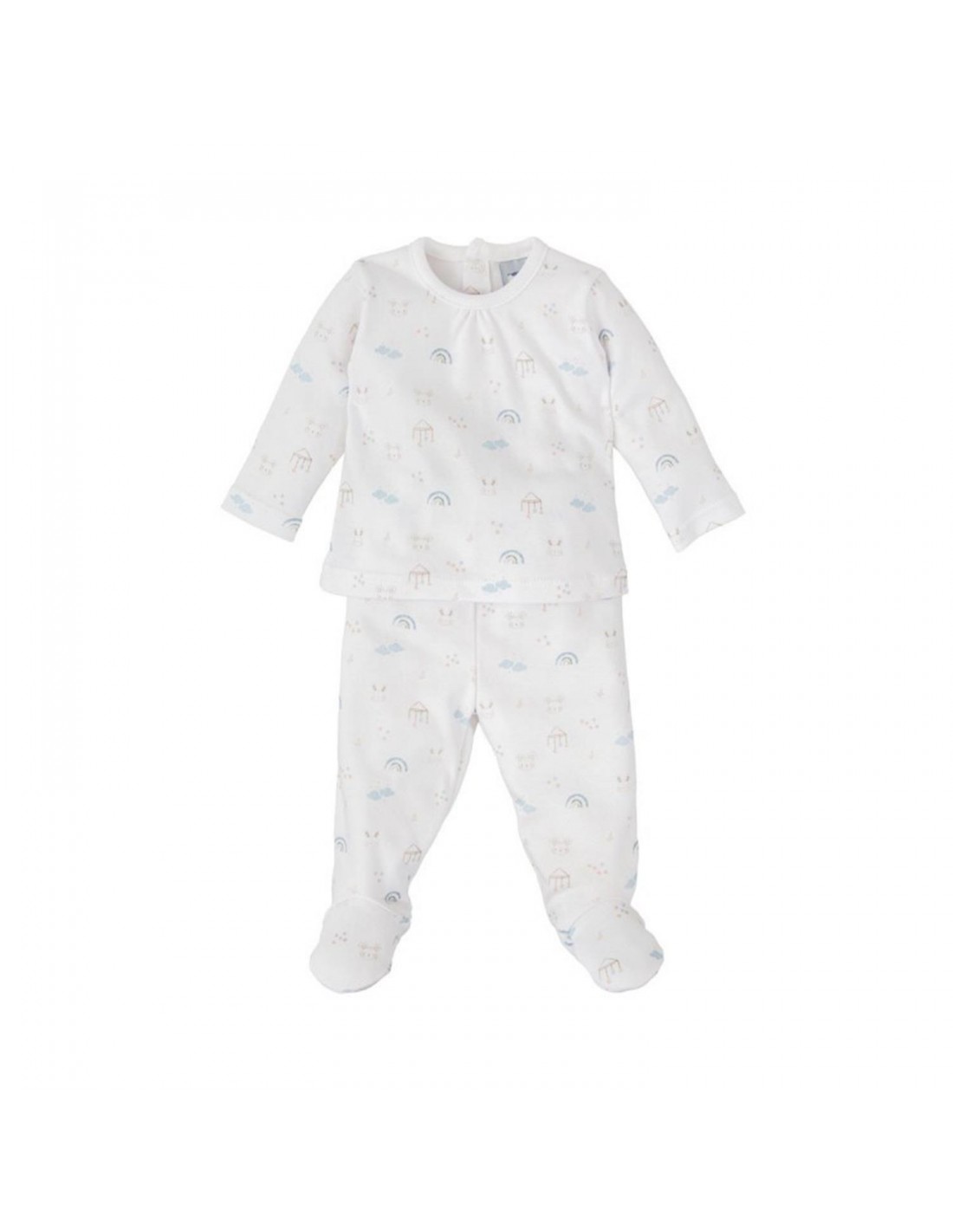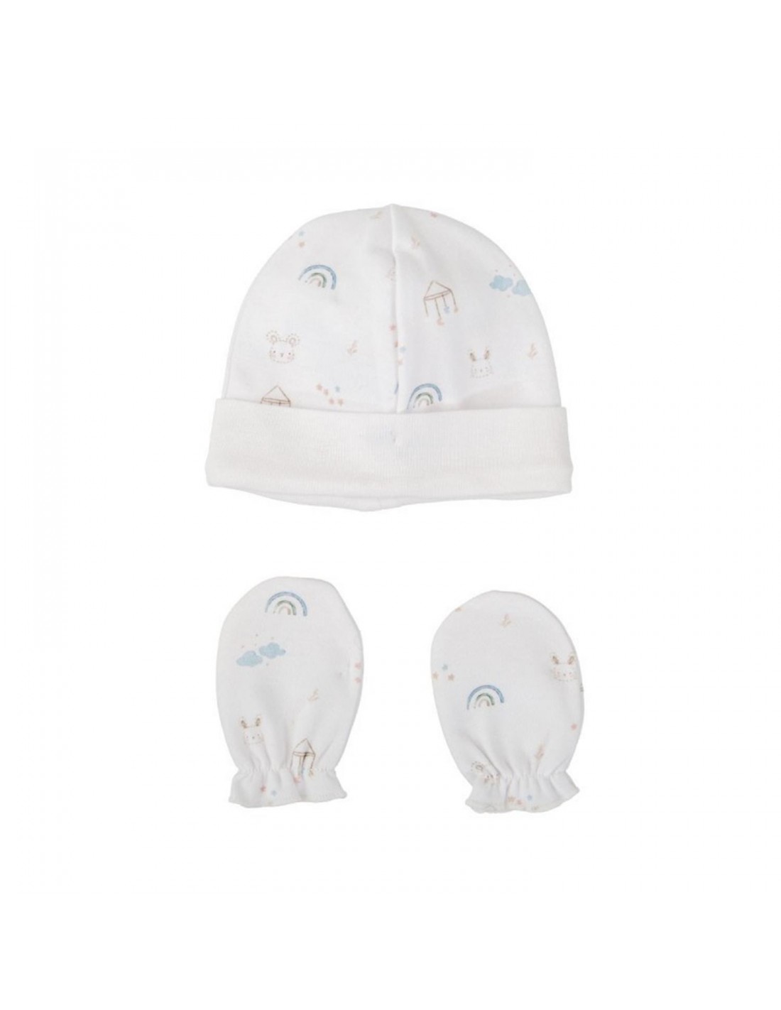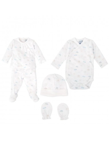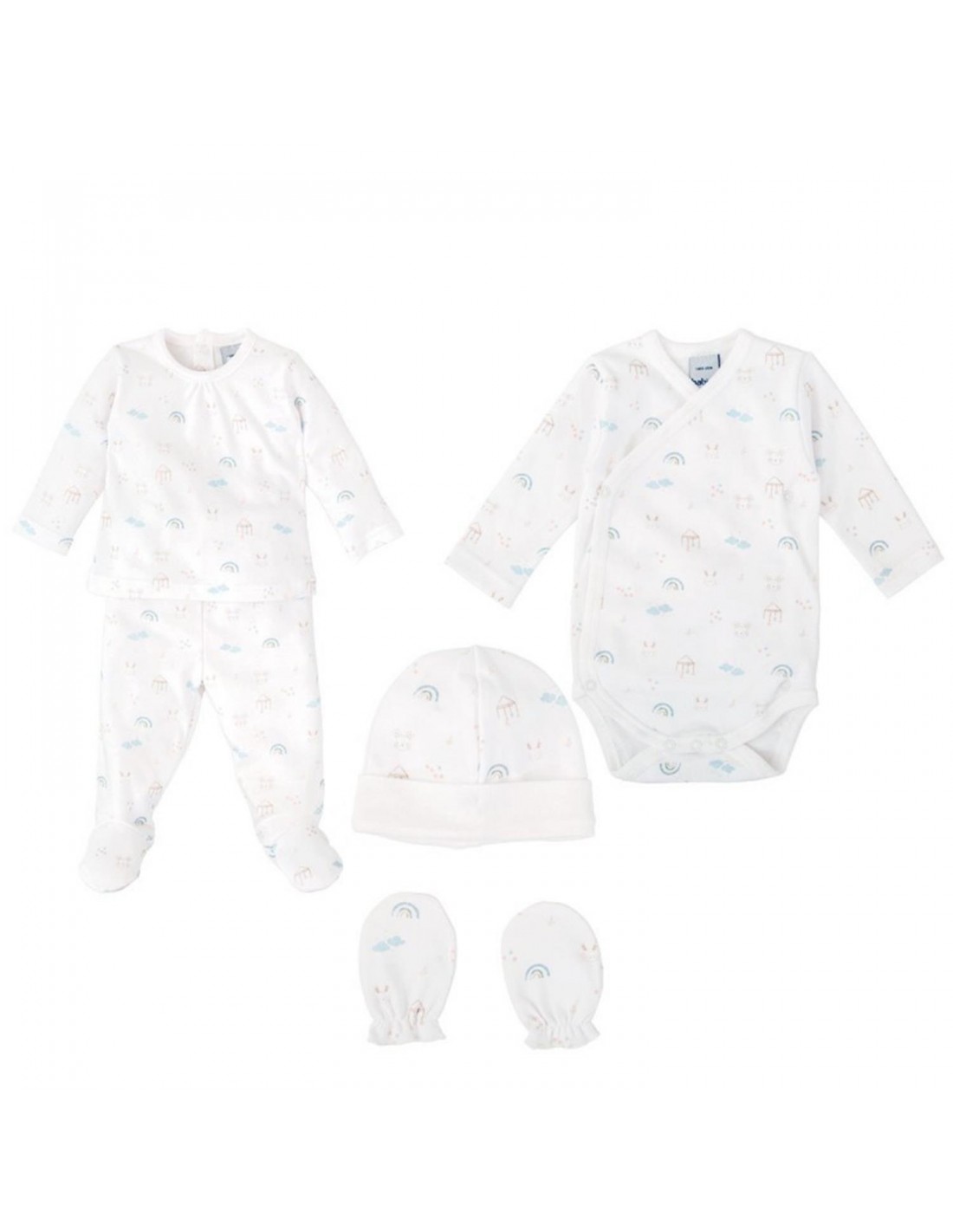 Este set de primera puesta es perfecto para dar la bienvenida al recién nacido con suavidad, comodidad y estilo. Confeccionado en algodón 100% de alta calidad, cada prenda presenta un dulce estampado en tonos pastel con arcoíris, nubes, ositos y casitas, aportando un aire tierno, neutro y armonioso. Incluye cinco piezas esenciales para los primeros días: body cruzado, camiseta de manga larga, polaina con pies, gorrito y manoplas. Todo el conjunto combina a la perfección con otros artículos de
