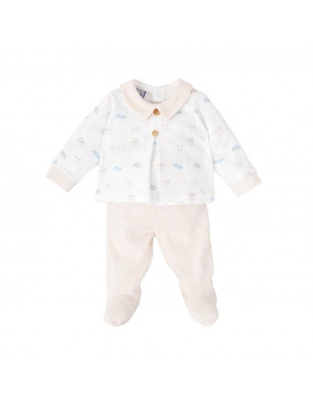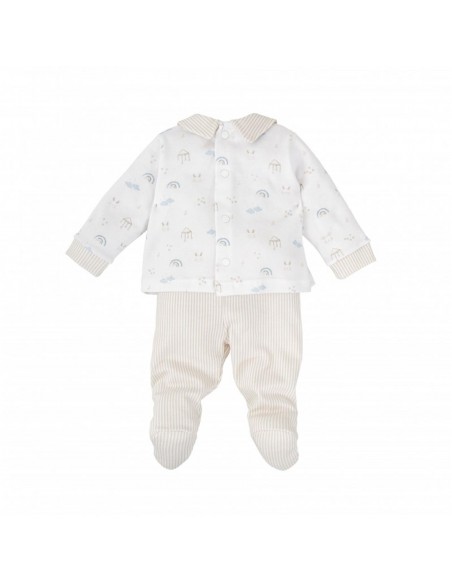 Conjunto para bebé destaca por su estilo alegre y clásico. La camiseta blanca de manga larga está decorada con un encantador estampado de arcoíris, nubes y caritas de animalitos en tonos suaves. El cuello camisero y los puños en tejido de rayas beige aportan un toque elegante, mientras que los botones decorativos en el pecho complementan el diseño con sutileza. Se completa con una polaina a rayas verticales en tono visón claro con pies integrados, ideal para mantener al bebé cómodo y abrigado.