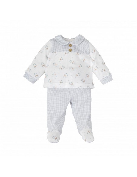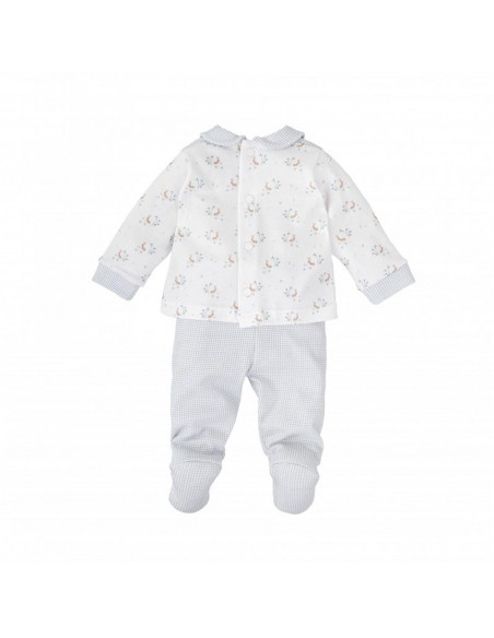 Este conjunto para bebé une encanto y comodidad en un diseño lleno de detalles cuidados. La camiseta de manga larga está confeccionada en algodón blanco con un delicado estampado floral en tonos suaves y se combina con un canesú y cuello bebé en tejido de cuadros vichy celestes, rematado con dos botones decorativos de madera que aportan calidez y estilo.