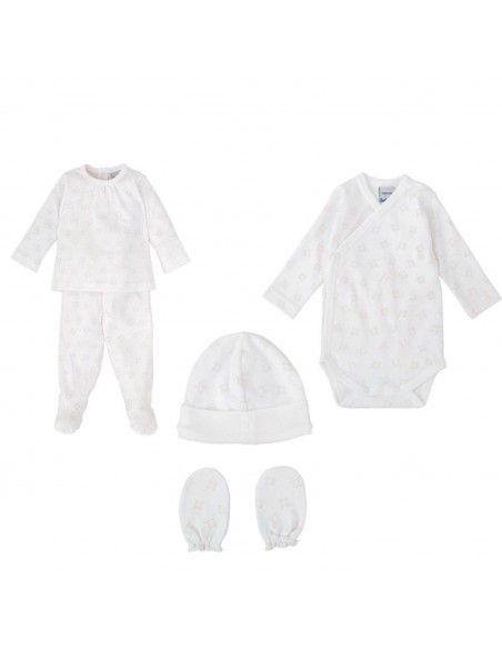 Incluye cinco prendas básicas y funcionales para el recién nacido: body cruzado, camiseta de manga larga, polaina con pies integrados, gorrito con vuelta y manoplas. Un set cómodo, neutro y práctico para completar la canastilla del hospi