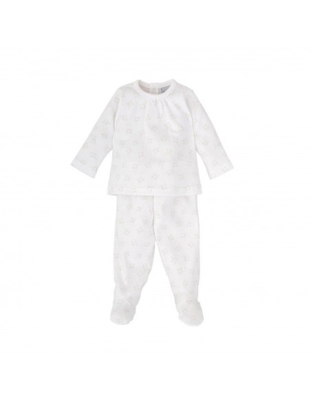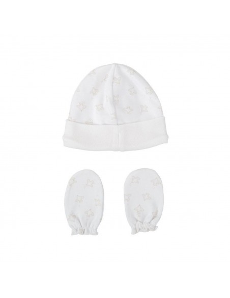 Este set de primera puesta es una opción ideal para los primeros días del bebé. Confeccionado en algodón 100% suave y natural, cada pieza presenta un dulce estampado de pequeños ositos en tono beige sobre fondo blanco, aportando calidez y ternura al conjunto.