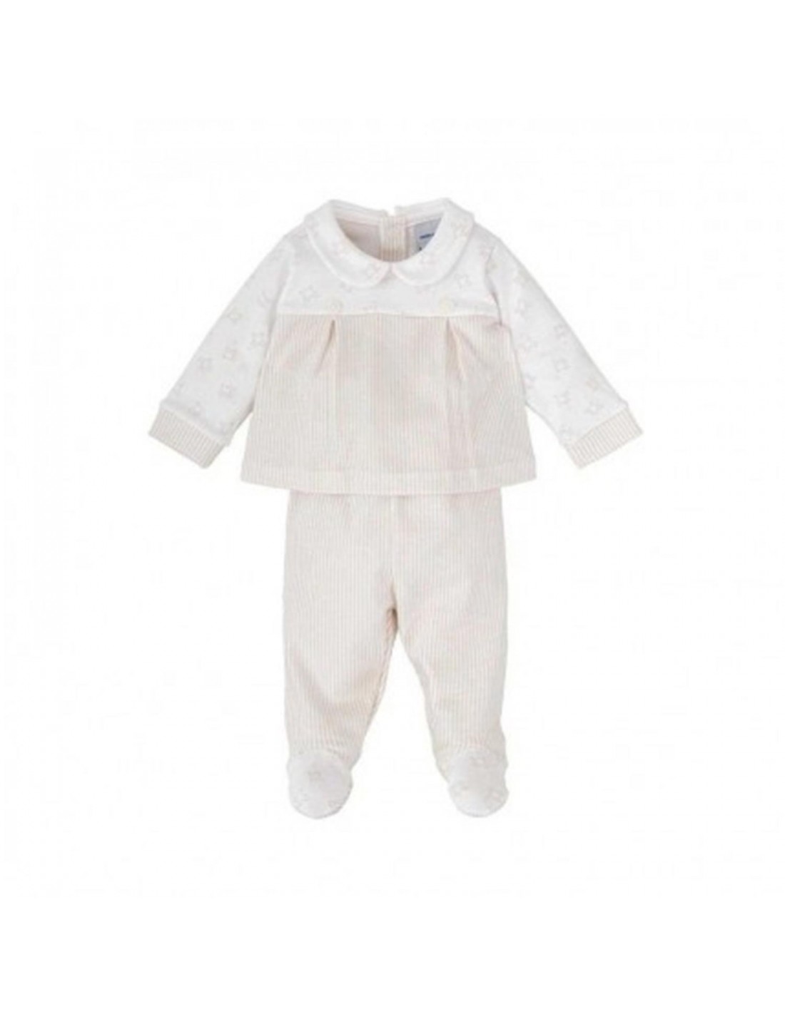 Conjunto para bebé combina dulzura y comodidad en un diseño clásico y delicado. Compuesto por una camiseta blanca de manga larga con un encantador estampado de pajarito en tono celeste y un pantalón tipo polaina a rayas finas, es ideal para los primeros meses del bebé. El cuello bebé con detalle rayado y el botón decorativo en el pecho añaden un toque elegante. Gracias a su tejido 100% algodón, garantiza