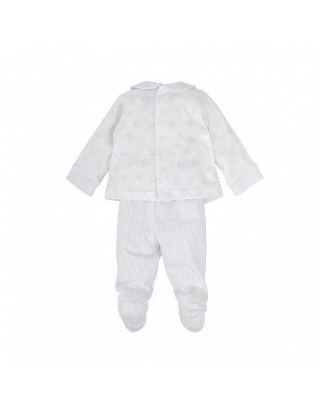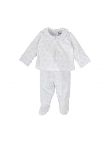 Conjunto para bebé combina dulzura y comodidad en un diseño clásico y delicado. Compuesto por una camiseta blanca de manga larga con un encantador estampado de pajarito en tono celeste y un pantalón tipo polaina a rayas finas, es ideal para los primeros meses del bebé. El cuello bebé con detalle rayado y el botón decorativo en el pecho añaden un toque elegante. Gracias a su tejido 100% algodón, garantiza suavidad y cuidado en contacto con la piel del recién nacido.