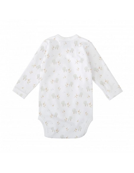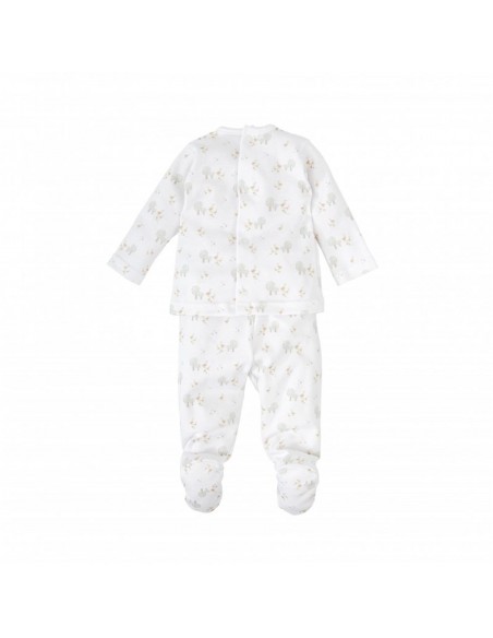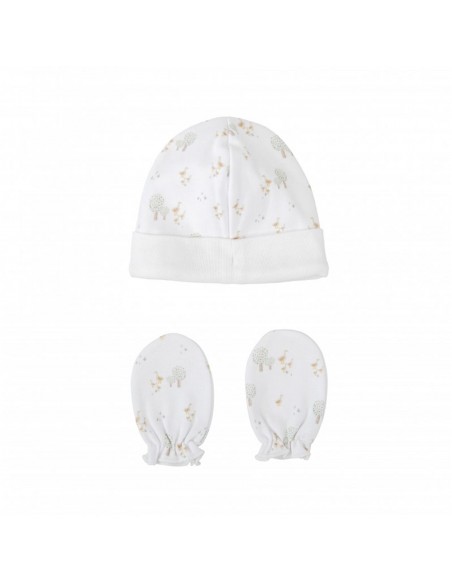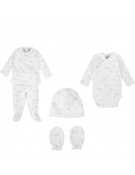 Este completo pack de nacimiento incluye todo lo necesario para los primeros días del bebé. Confeccionado en algodón 100% suave y delicado, el conjunto está decorado con un dulce estampado de arbolitos y patitos en tonos neutros. Es una opción ideal tanto para llevar al hospital como para regalar.