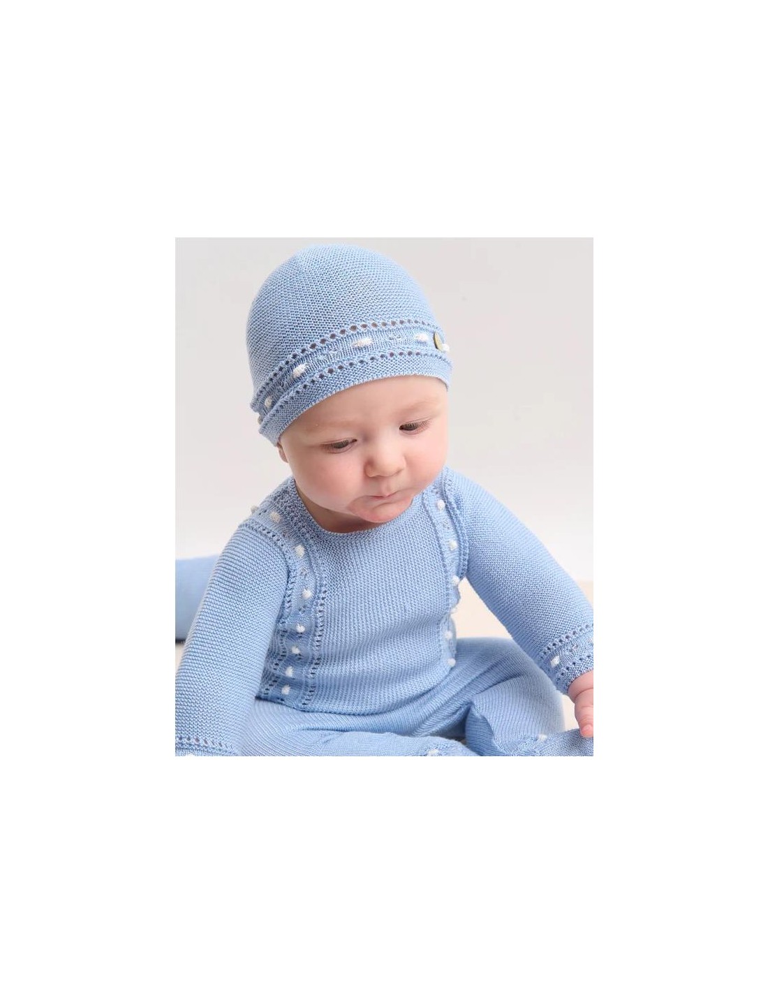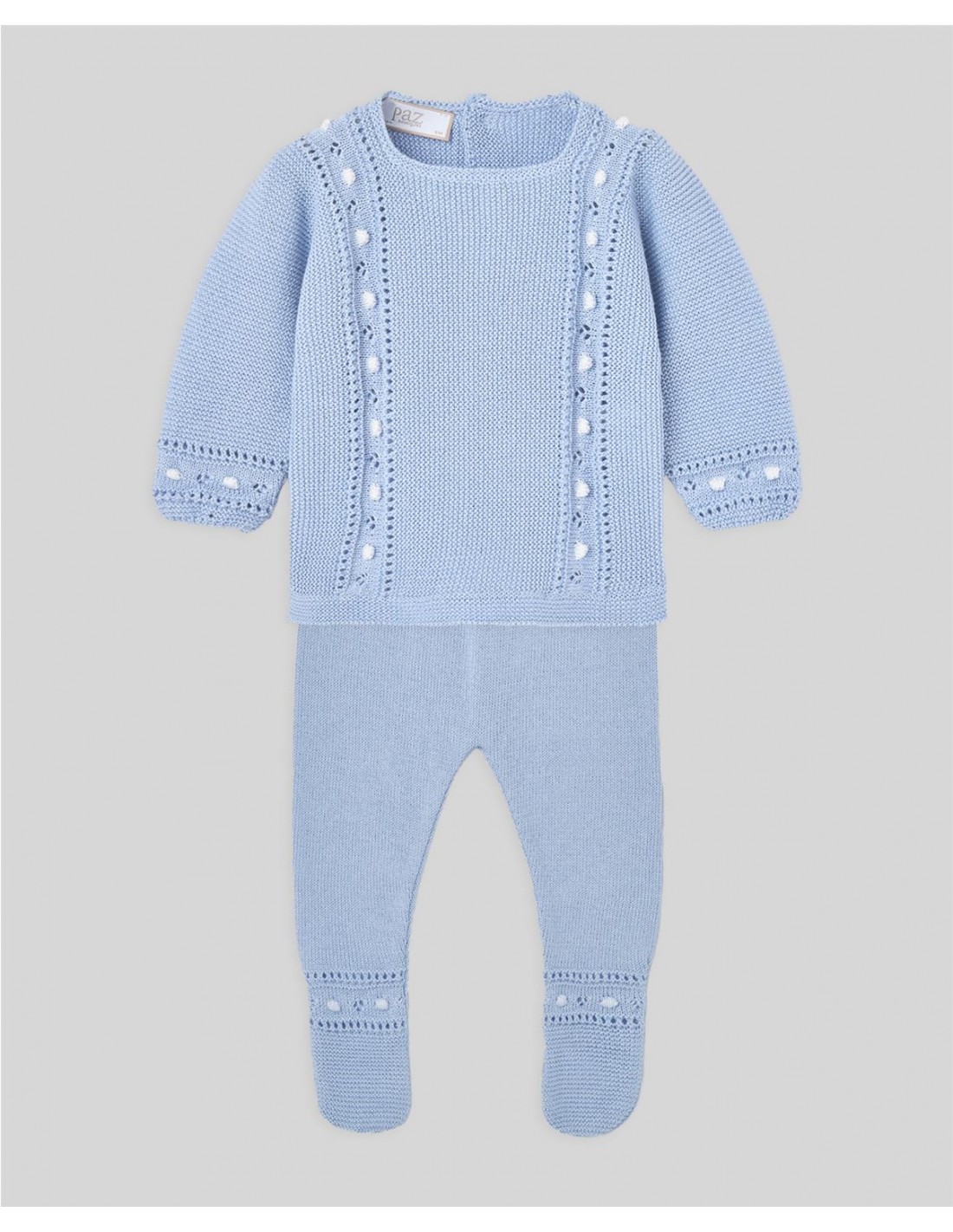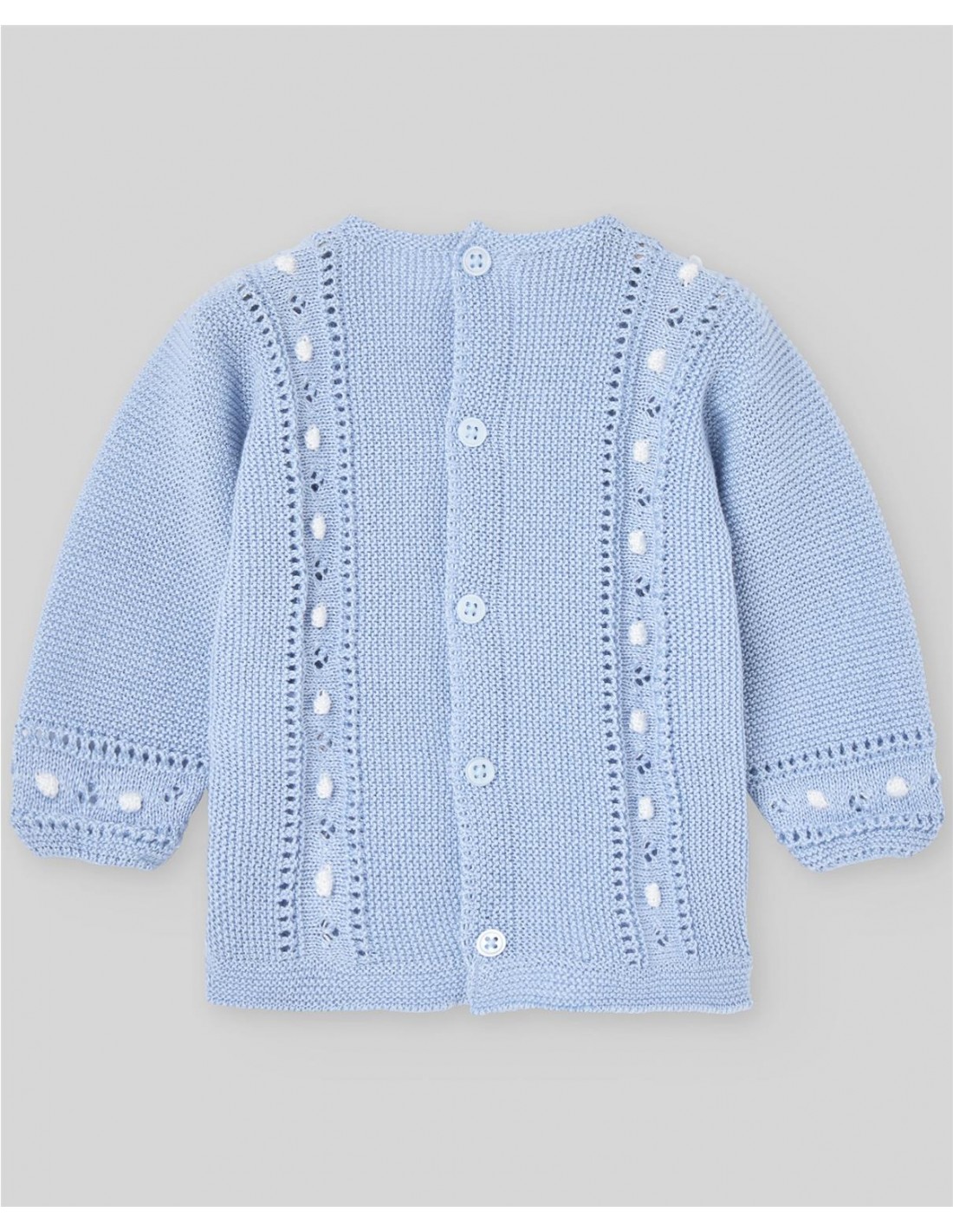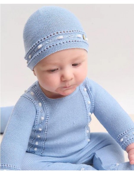 Conjunto para bebé con jubón y polaina de la colección "Alegra". Realizado en punto fino de algodón con detalles cuidados, combina confort y un estilo clásico atemporal.