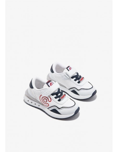 El modelo en blanco y azul marino tiene cordones elásticos y corchetes para una mejor sujeción. Están decoradas con el logo de Conguitos en rojo y luces en la suela para darle un toque especial. Fabricadas con micronapa.