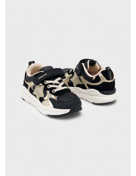 Zapatillas deportivas para niña, de gran versatilidad para sus aventuras diarias. Material exterior combinado de piel y otros materiales. Todos nuestros zapatos se realizan con pieles libres de cromo. Forro interior y plantilla de algodón transpirable. Suela gruesa de estilo actual. Cierre con velcro ajustable que garantiza una perfecta sujeción del pie. Detalle de estrellas. Detalle de purpurina.