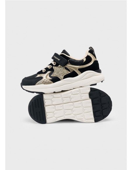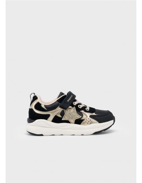 Zapatillas deportivas para niña, de gran versatilidad para sus aventuras diarias. Material exterior combinado de piel y otros materiales. Todos nuestros zapatos se realizan con pieles libres de cromo. Forro interior y plantilla de algodón transpirable. Suela gruesa de estilo actual. Cierre con velcro ajustable que garantiza una perfecta sujeción del pie. Detalle de estrellas. Detalle de purpurina