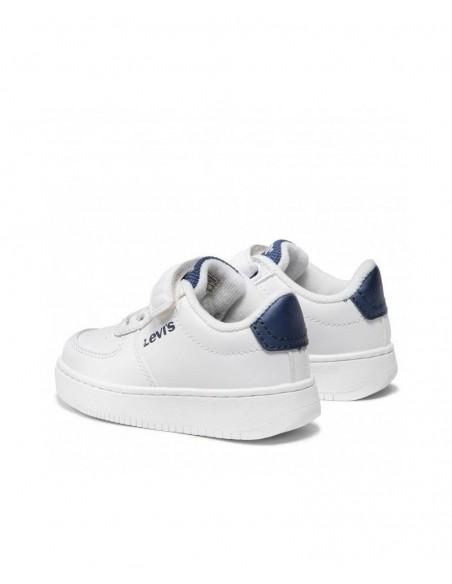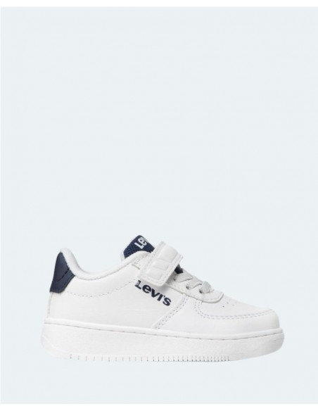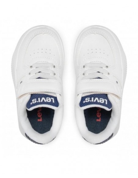 Deportiva básica blanca de Levis, modelo New Union para los más pequeños, tallaje 22 al 27. LLeva gomas en el empeine y cierre de velcro para un mayora ajuste y sujección.
