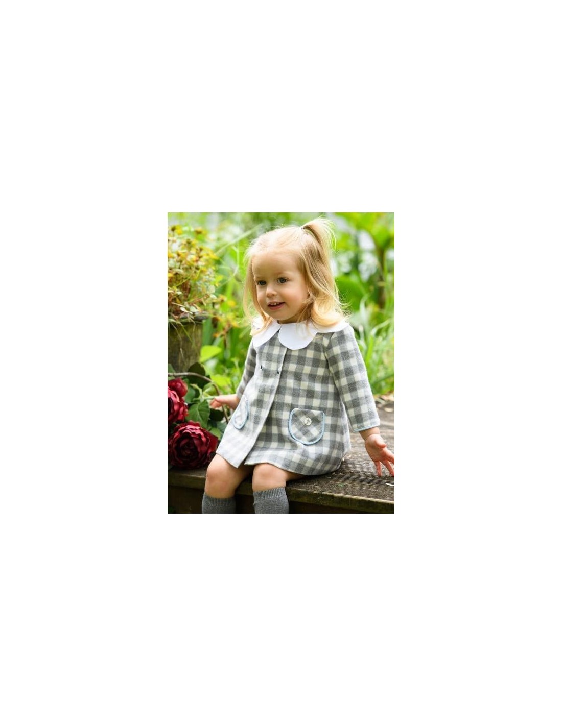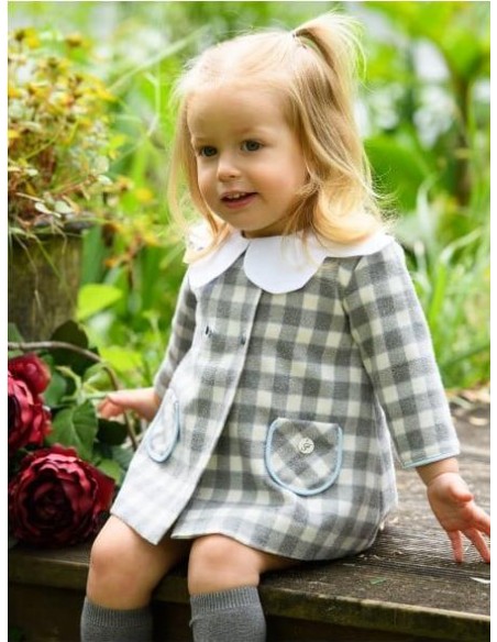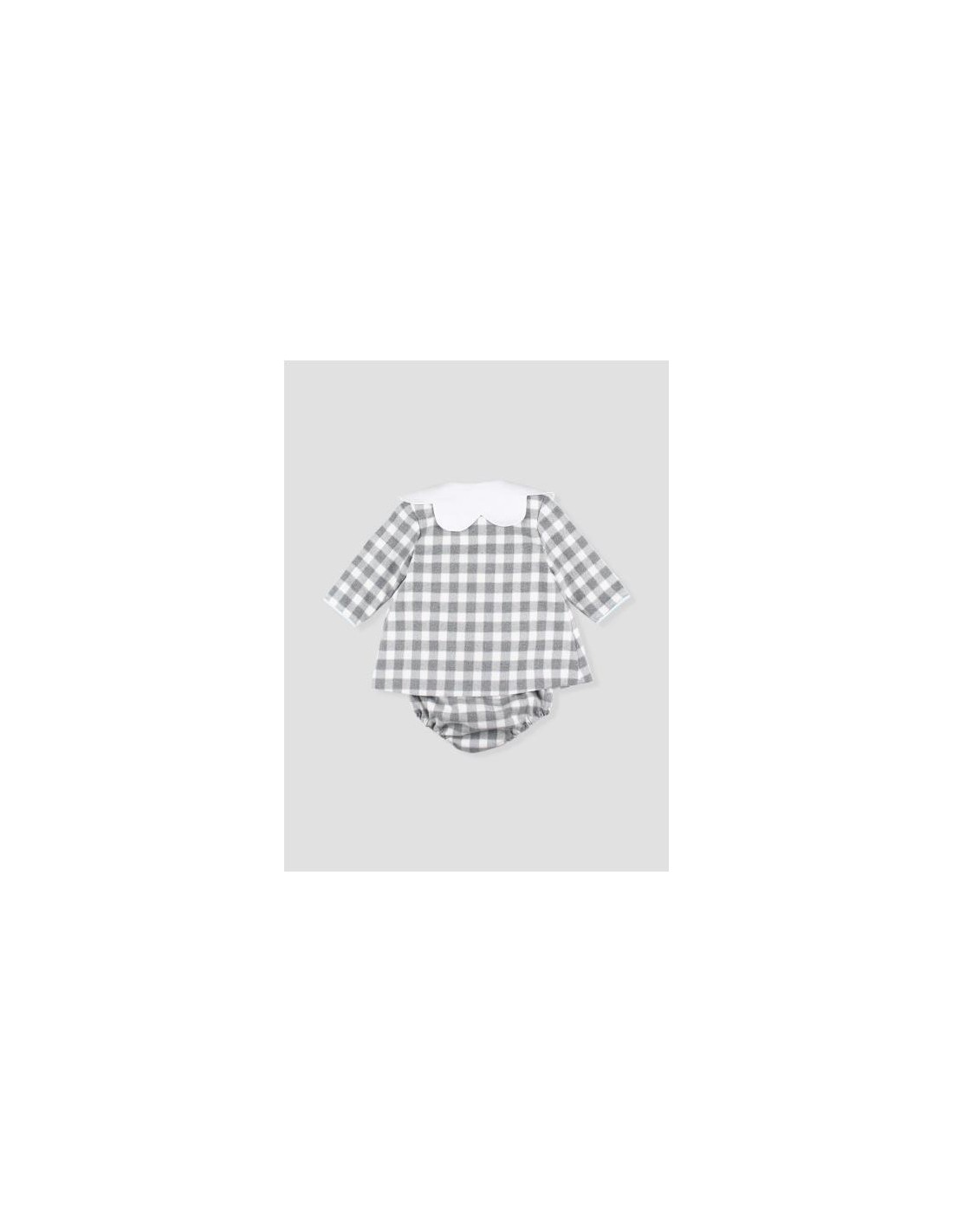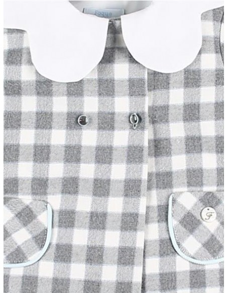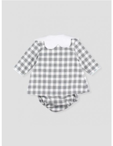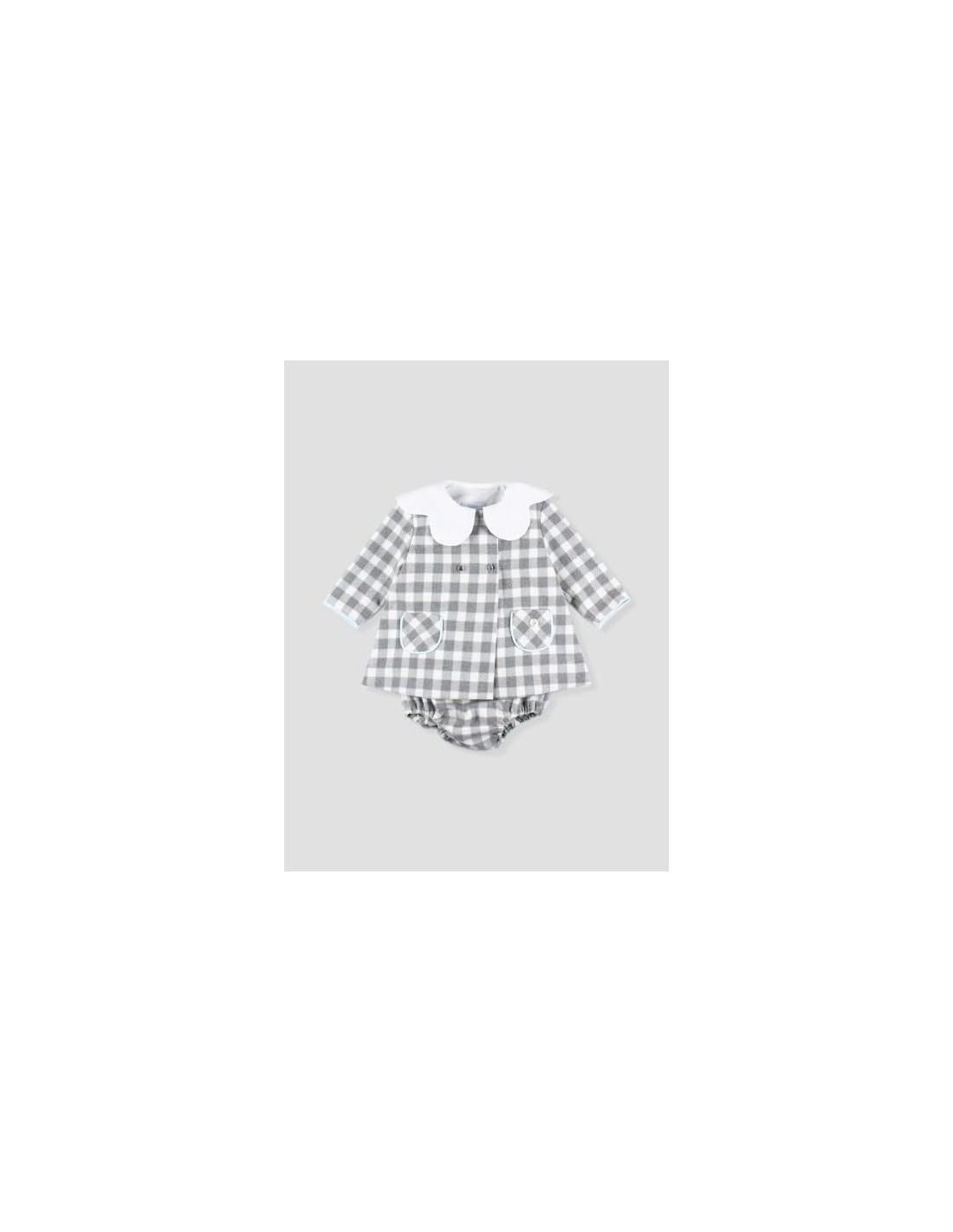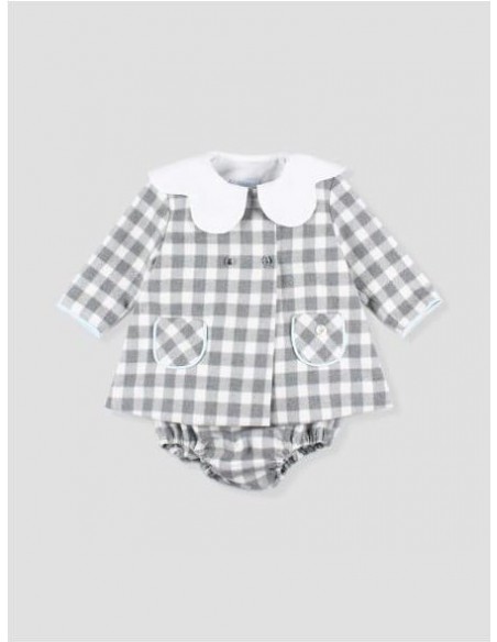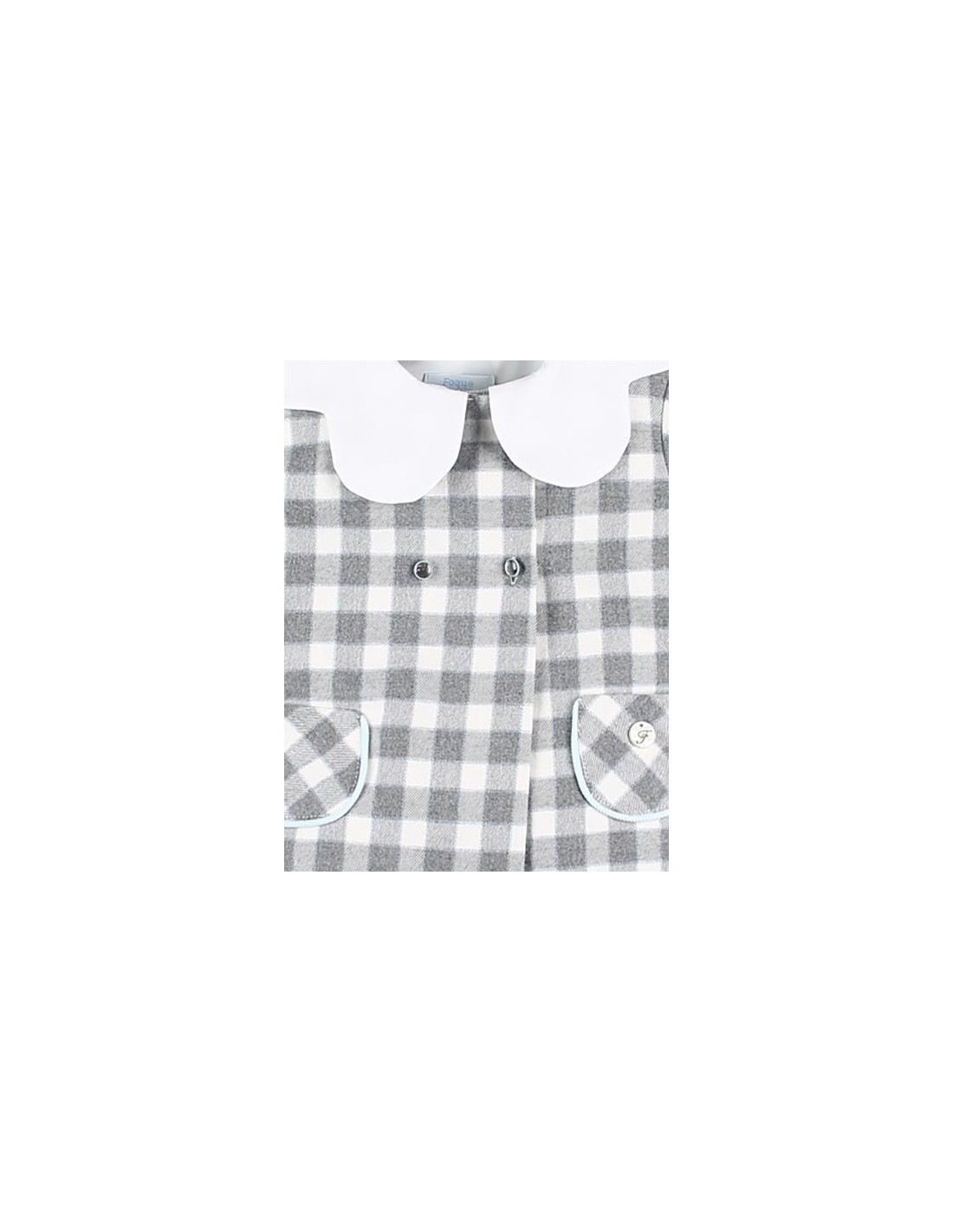 Jesusito en tejido de cuadros grises destaca por su aire atemporal y sofisticado. El cuello bebé blanco aporta un toque clásico, mientras que los bolsillos delanteros con solapa y vivo azul le añaden un aire coqueto. El corte evasé garantiza comodidad y movimiento para las más pequeñas. Incluye braguita a juego para un conjunto completo y armonioso.