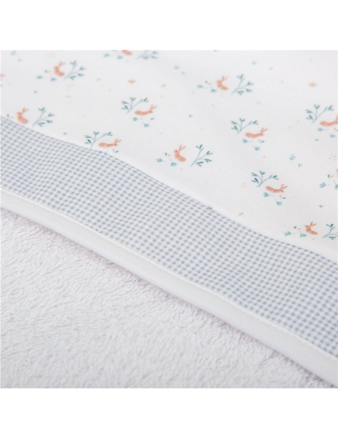 La capucha forrada luce un encantador estampado floral en tonos pastel a juego con el resto de la colección floral, y se remata con una franja decorativa en tejido de cuadros vichy celeste que añade un toque de elegancia y armonía al conjunto. Un accesorio imprescindible, tanto en casa como