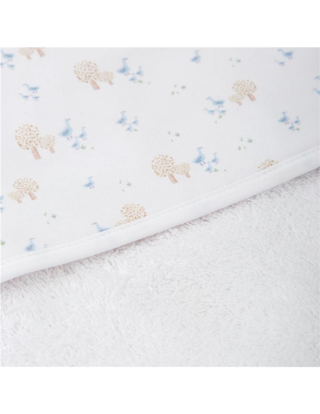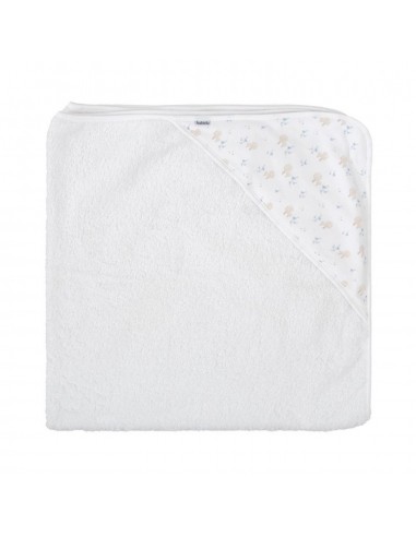 Esta adorable toalla de baño con capucha está confeccionada con tejido de rizo blanco, muy suave y absorbente, ideal para envolver al bebé tras el baño. La capucha está forrada con un dulce estampado de arbolitos y pajaritos en tonos suaves, que aporta un toque tierno y natural al conjunto.