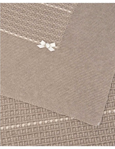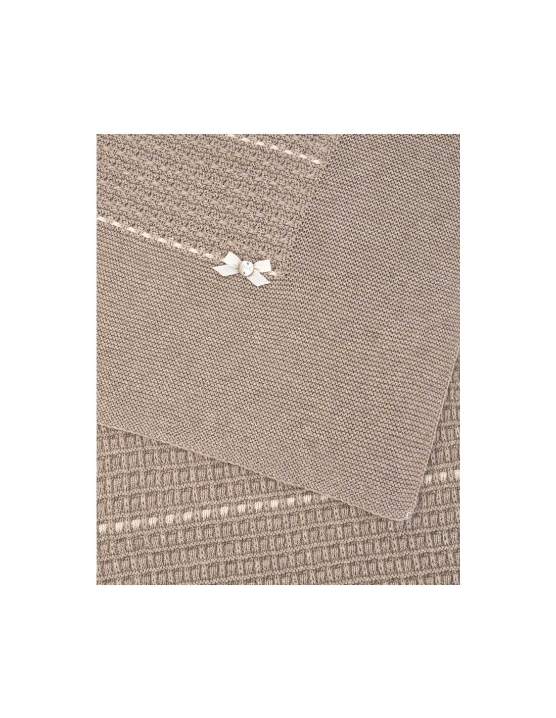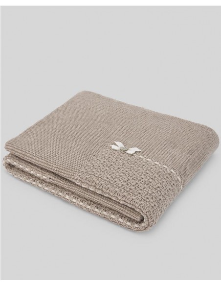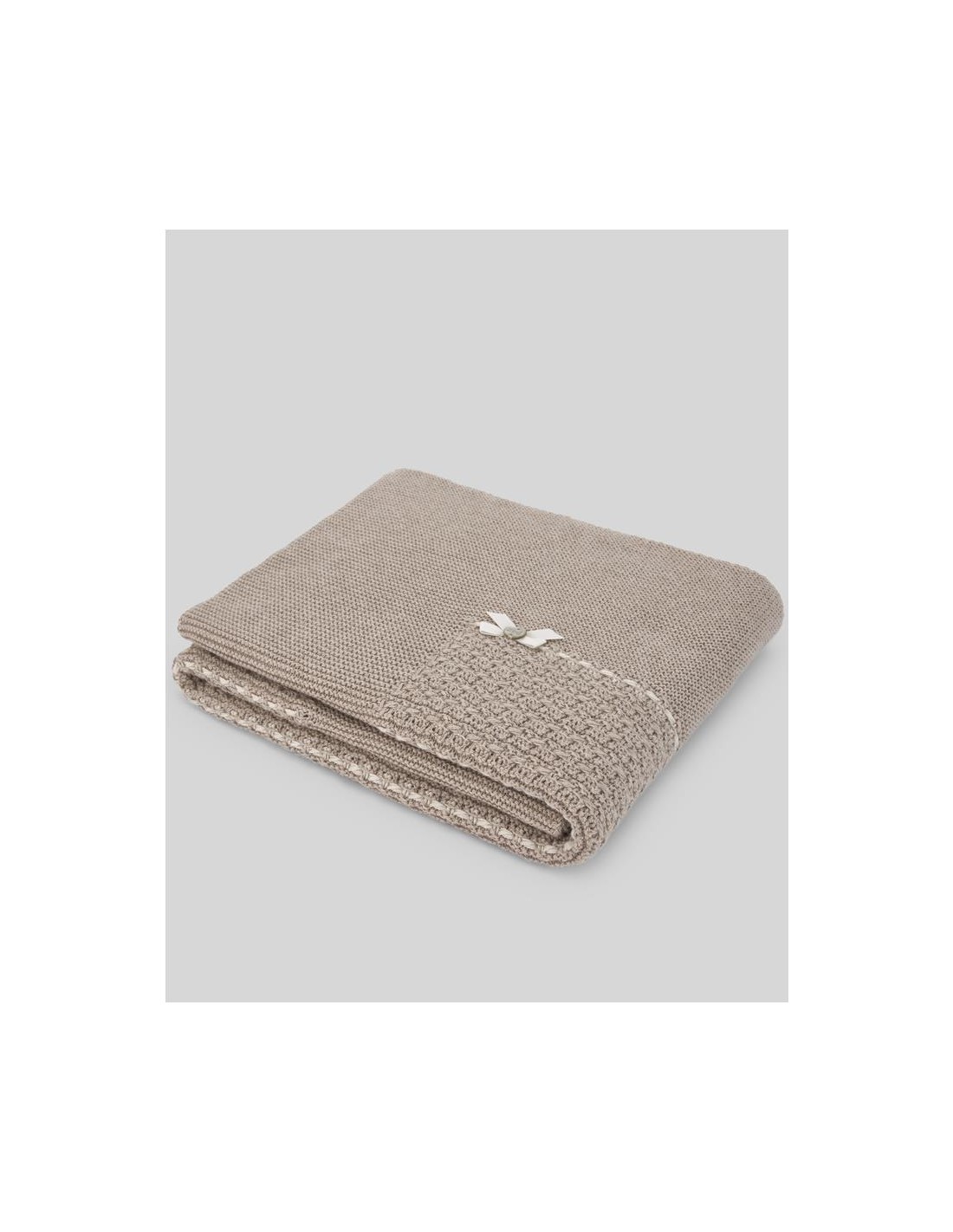 Manta en algodón y cashmere de punto, con detalle de cadenetas en la parte central y placa de nácar con lacito. Con una medida de 73 x 98 cm, es ideal para arropar o portar al bebé en brazos.