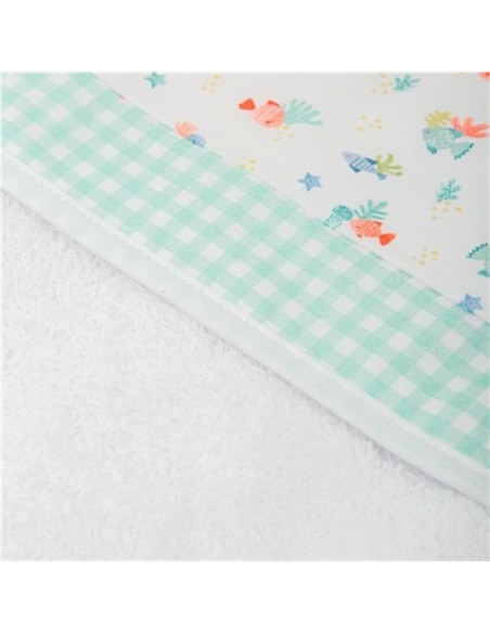 Capa de baño para bebé confeccionada en suave rizo de algodón, perfecta para secar y envolver al pequeño después del baño. Incorpora capucha con delicado estampado de peces y detalles marinos en tonos suaves, combinada con cuadro vichy rosa que aporta un toque clásico y encantador.