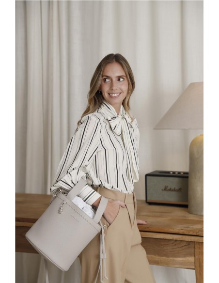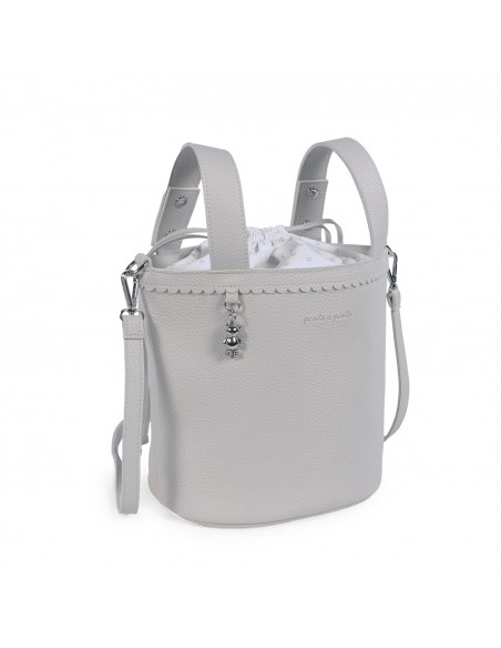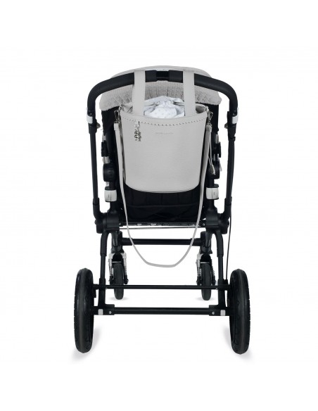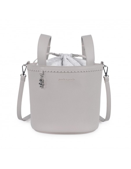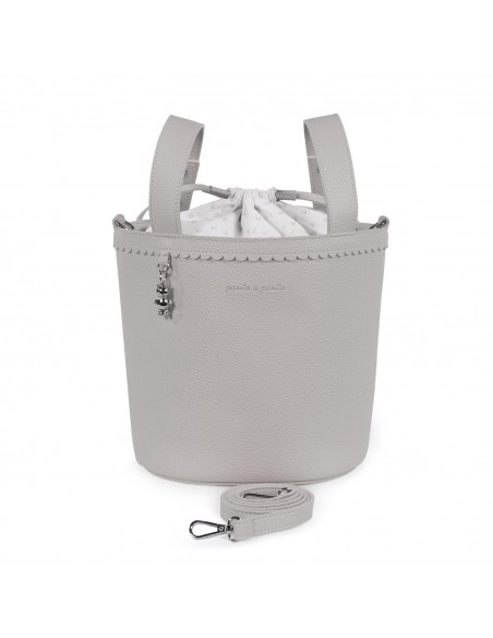 Bolso bucket para carrito de bebé Icon Smoke Pasito a Pasito, fabricada en polipiel de alta calidad en un elegante tono rosa pastel. Su diseño tipo cubo incluye un delicado borde festoneado y un detalle colgante metálico en forma de osito que aporta un toque distintivo. . Es el accesorio ideal para llevar lo esencial del bebé con estilo y comodidad durante tus paseos. Su tamaño compacto es perfecto para organizar pañales, biberones y otros objetos indispensables.