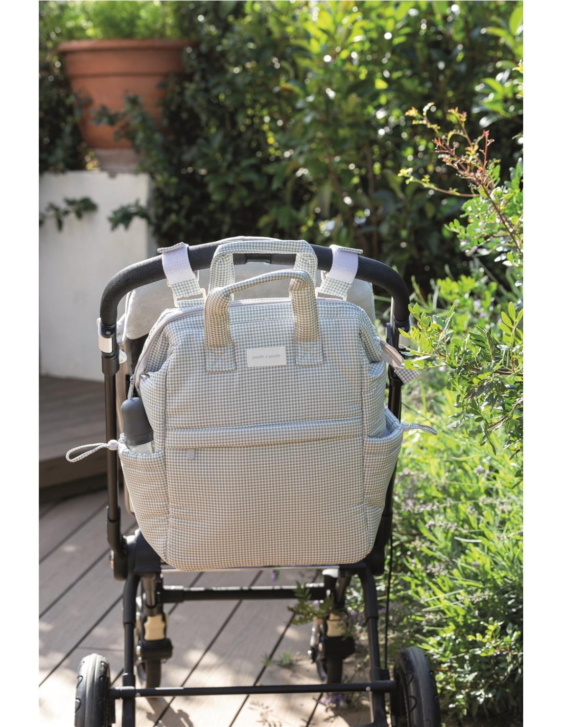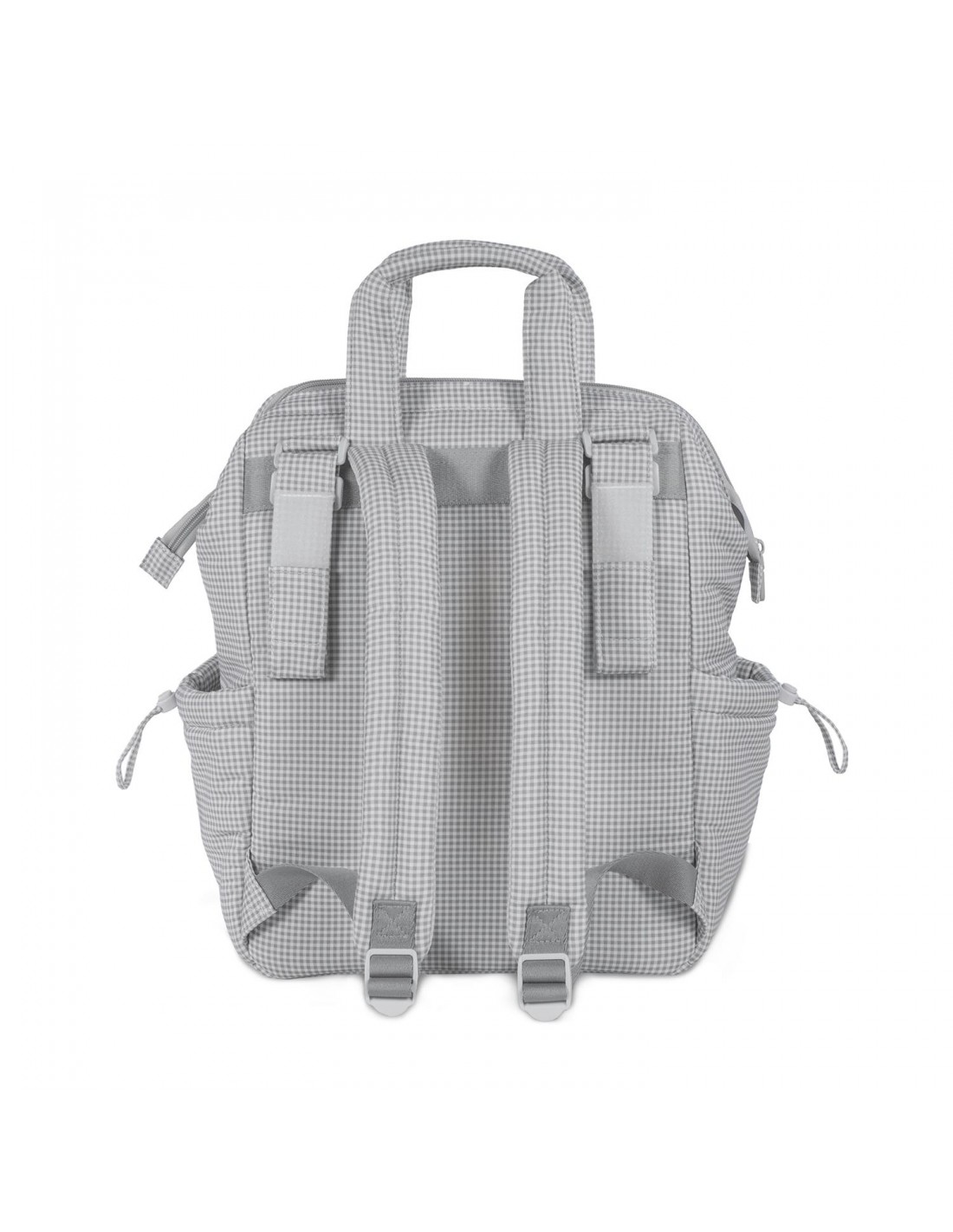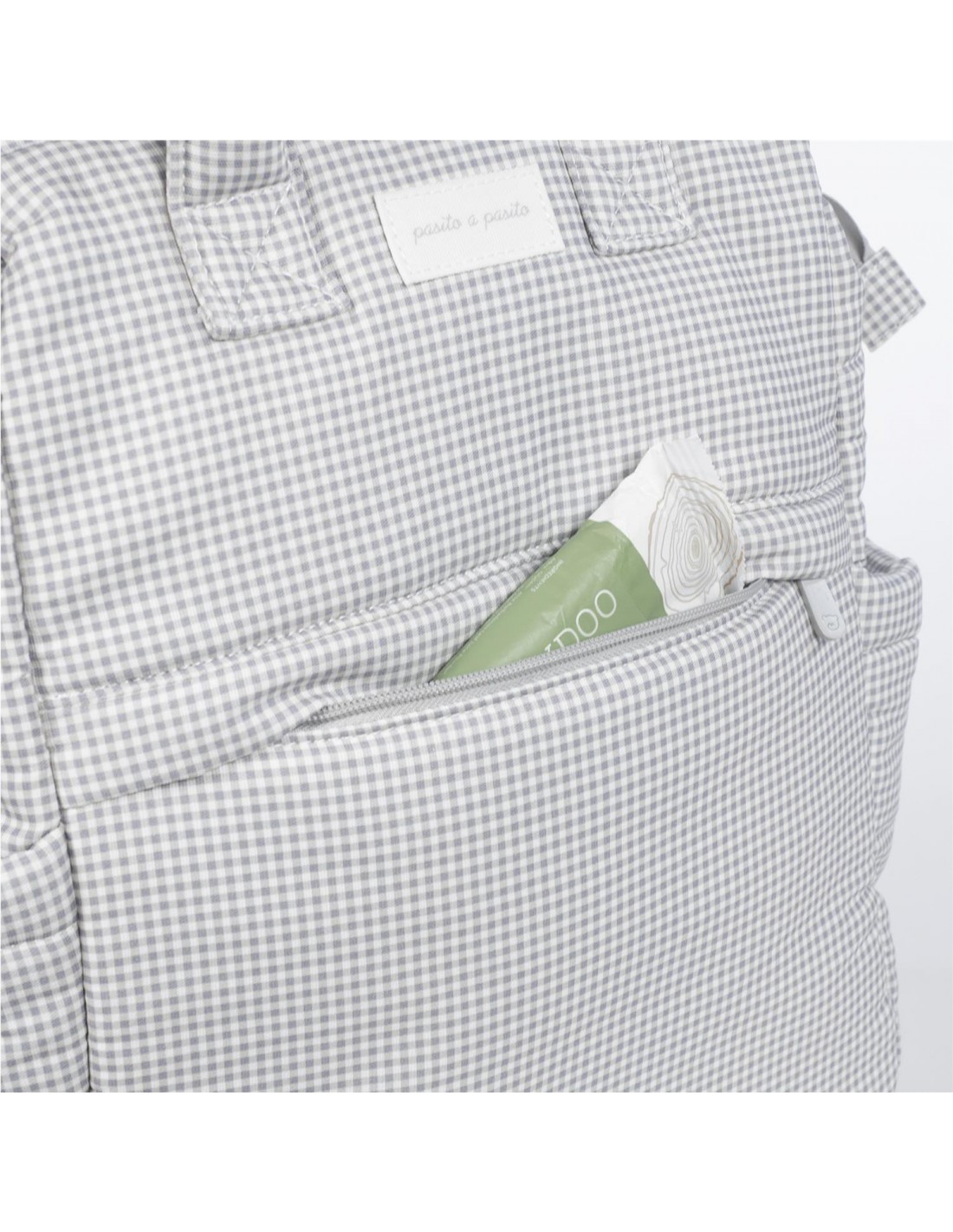 La mochila maternal Little Bloom Vichy gris de Pasito a Pasito, confeccionada en loneta de algodón 100% con un delicado estampado de cuadros. Su tratamiento water resistant la hace resistente al agua, garantizando protección y durabilidad en el día a día. Esta mochila ofrece gran capacidad y múltiples compartimentos, facilitando la organización de todo lo necesario para el bebé. Bolsillos interiores y exteriores para tenerlo todo a mano y en orden. También incorpora dos bolsillos laterales.
