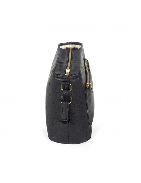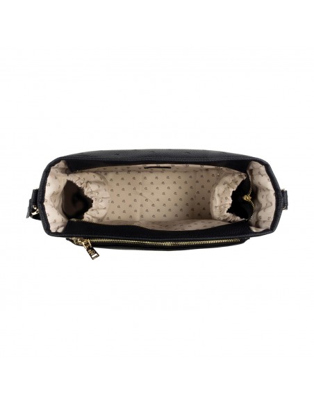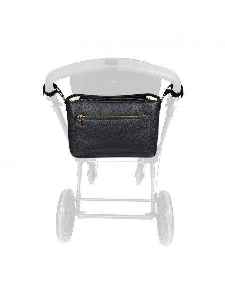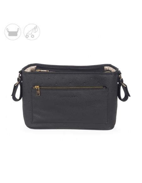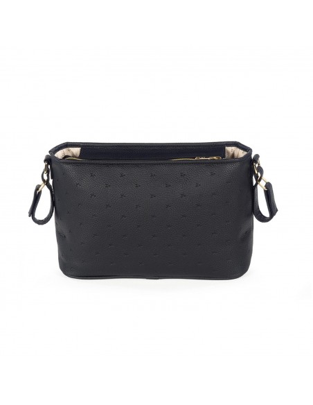 Bolso organizador London en polipiel negra con estrellas grabadas para silla de paseo de gran capacidad para llevar todo lo necesario para el paseo del bebe. Tiene bolsillos exteriores e interiores para poder tener todo ordenado y a mano. Tiene un bolsillo interior plastificado para la ropa mojada. Asas cortas para su colocación en cualquier modelo de silla de paseo.